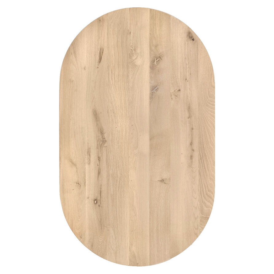 Een eiken tafelblad met halve cirkel uiteinden - van sfeervol rustiek eikenhout en 2,7 cm dik - dat op maat wordt gemaakt. Een verlijmd tafelblad met klassieke look & luxe brede lamel, optioneel met verjongde rand. Configureer naar wens! Lees meer