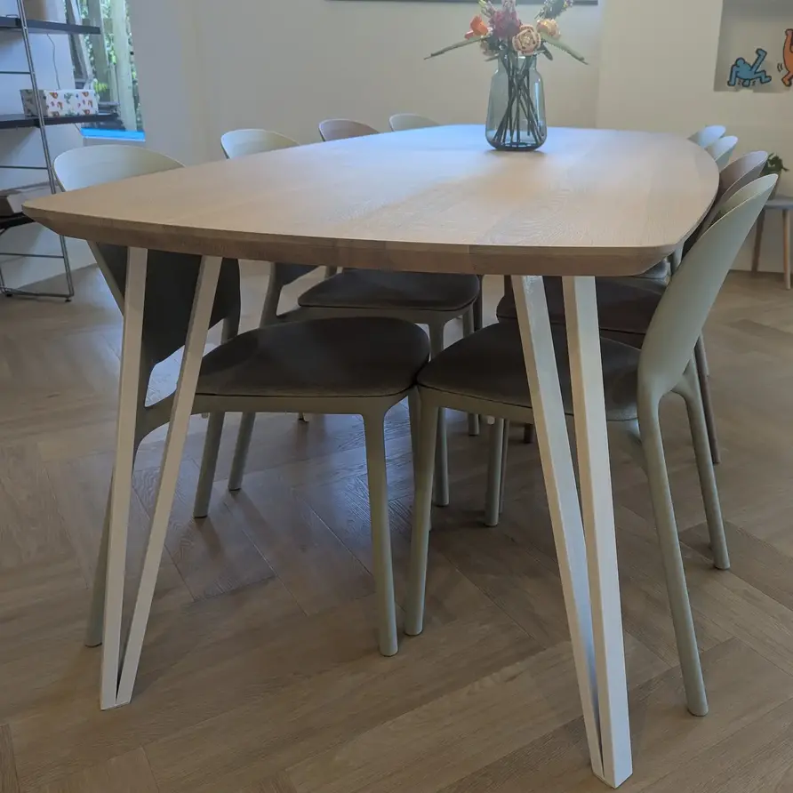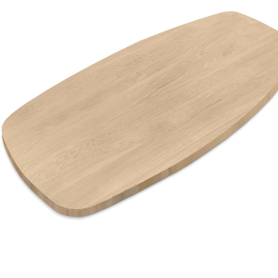 Een Deens ovaal eiken tafelblad - van stijlvol foutvrij eikenhout en 4 cm dik - in verschillende (vaste) afmetingen. Een prachtig verlijmd tafelblad met moderne look & luxe brede lamel, optioneel met verjongde rand. Configureer compleet naar wens! Lees meer