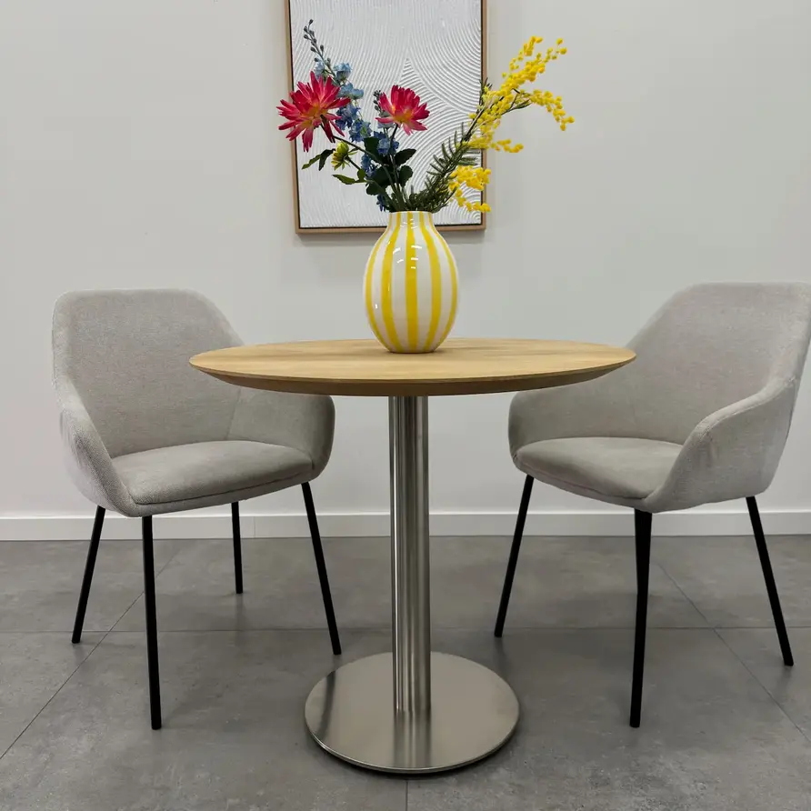 Eiken bistrotafel - rond - 2,7 cm dik (massief) - foutvrij eikenhout (A/B) - brede lamel (9-12 cm) - ambachtelijk verlijmde horeca tafel - kunstmatig gedroogd (KD) 8-12%. Deze prachtige ronde eiken bistrotafel van 27 mm dik wordt ambachtelijk gemaakt, met veel zorg & aandacht voor detail, en is verkrijgbaar in diverse vaste maten. Een ronde eiken bistro tafel is gezellig, praktisch en ruimtebesparend, perfect voor in de horeca, maar ook voor thuis! Het foutvrije eikenhout heeft een A-kwaliteit zichtzijde, wat betekent dat er praktisch geen noesten en scheuren aanwezig zijn. Dit zorgt voor een stijlvol en elegant uiterlijk. Ook bent u bij deze eikenhouten tafel verzekerd van brede lamellen, voor een (extra!) mooie tafel met een luxe accent.