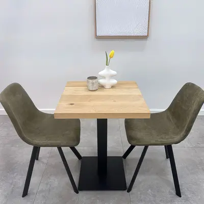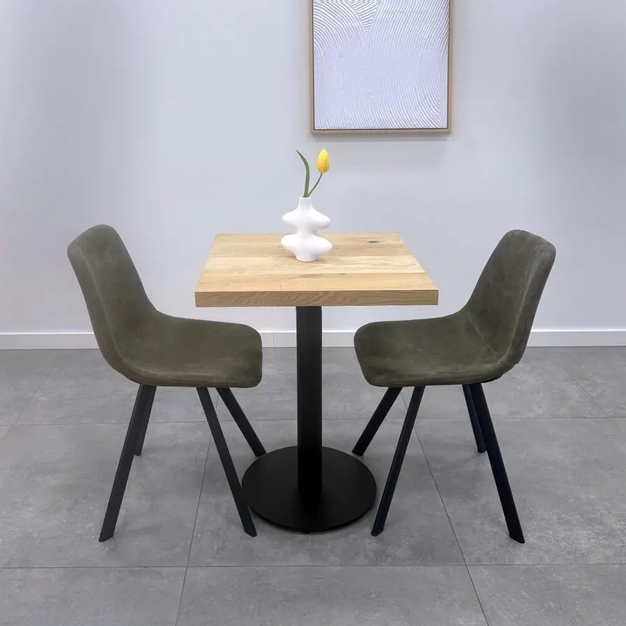 Een strakke eiken bistrotafel - vierkant, van sfeervol rustiek eikenhout en 2,7 cm dik - verkrijgbaar in verschillende (vaste) afmetingen. Optioneel met verjongde rand & met een prachtige collectie bijpassende horeca onderstellen. Configureer naar wens! Lees meer