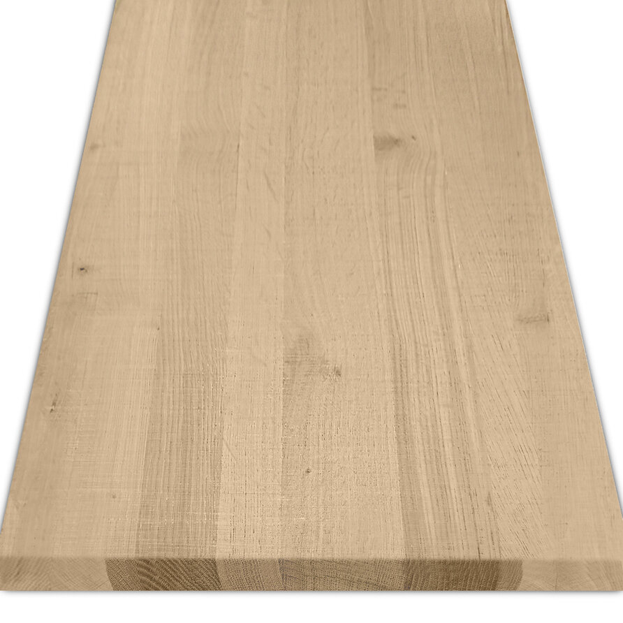 Scherpe randen & hoeken: Onze eiken bladen worden met harde (scherpe) kanten geleverd, houd hier dus rekening mee. Kiest u voor de optie 'inclusief behandeling' dan worden de randen & hoeken wel 'gebroken', oftewel afgewerkt met een vellingkantje (vergelijkbaar met onze tafelbladen).