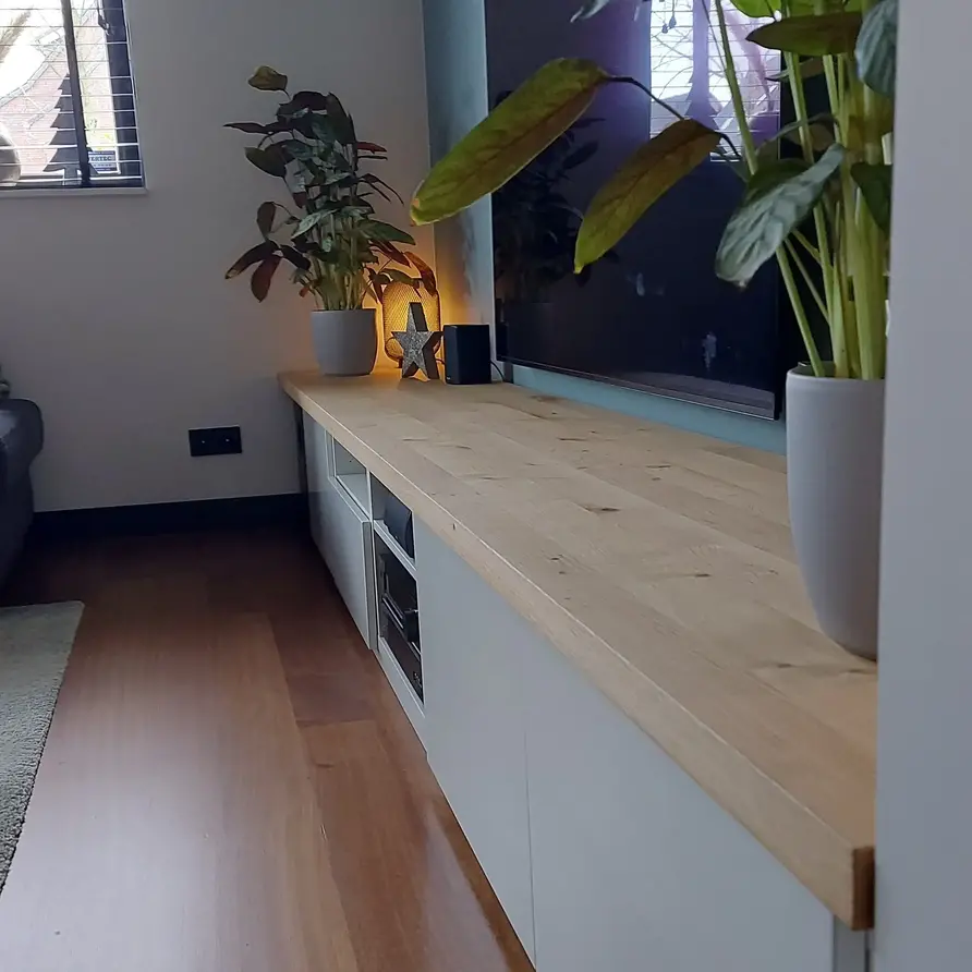 Een eiken blad - van sfeervol rustiek eikenhout en 4 cm dik - dat op maat wordt gemaakt. Een prachtige verlijmde "eiken plank", ideaal voor een maatwerk interieur (meubel)project. Configureer uw eikenhouten blad compleet naar wens! Lees meer