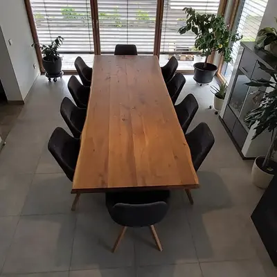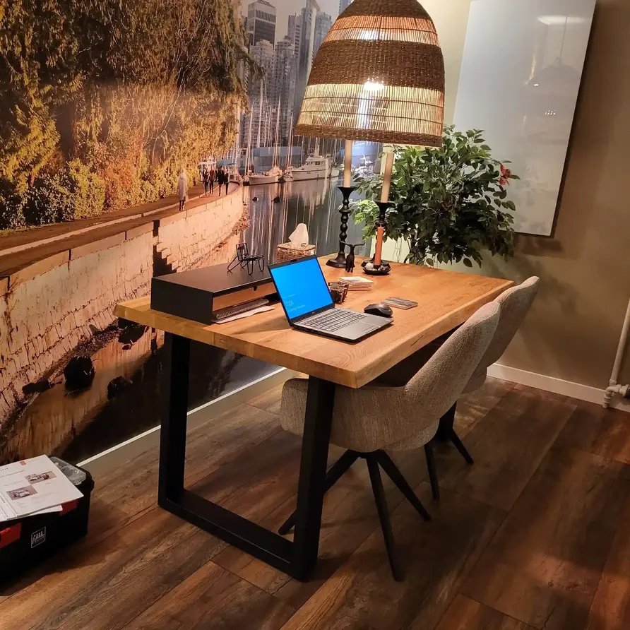 Let op: Door de natuurlijke rand kan de breedte (zoals beschreven bij de productspecificaties) - op bepaalde punten - tot maximaal 10 cm afwijken. Het tafelblad wordt aan de onderzijde standaard voorzien van (werkings)groeven/sleuven om de kans op werking (vervorming / kromtrekking) te verkleinen. Het is niet mogelijk om dit tafelblad te voorzien van staalprofielen.