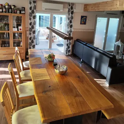 Een eiken boomstam tafelblad - van sfeervol geborsteld rustiek eikenhout en 4,5 cm dik - in verschillende (vaste) afmetingen. Een prachtig verlijmd tafelblad met 3 luxe XXL lamellen + V-groeven en stoere boomstamrand, naar wens te configureren! Lees meer