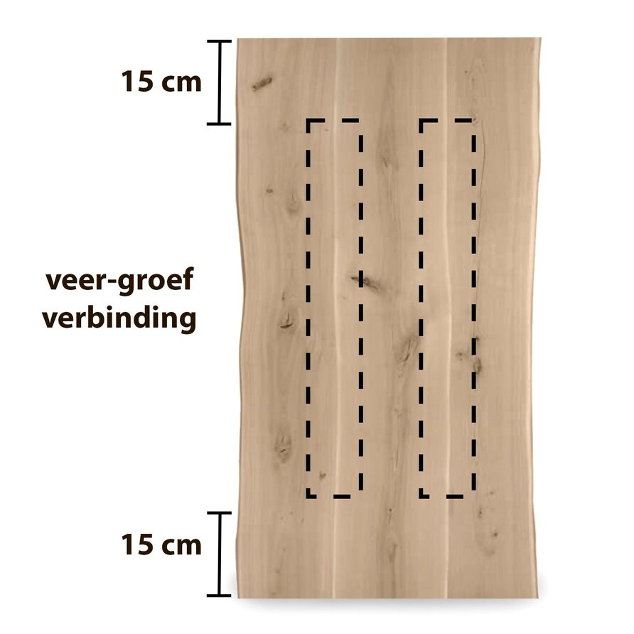 Let op: Door de natuurlijke rand kan de breedte (zoals beschreven bij de productspecificaties) - op bepaalde punten - tot maximaal 10 cm afwijken. Het tafelblad wordt aan de onderzijde standaard voorzien van 2 staalprofielen & (werkings)groeven/sleuven om de kans op werking (vervorming / kromtrekking) te verkleinen, voor een stabiel tafelblad.