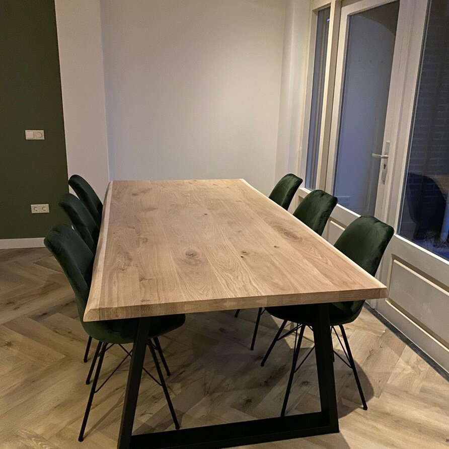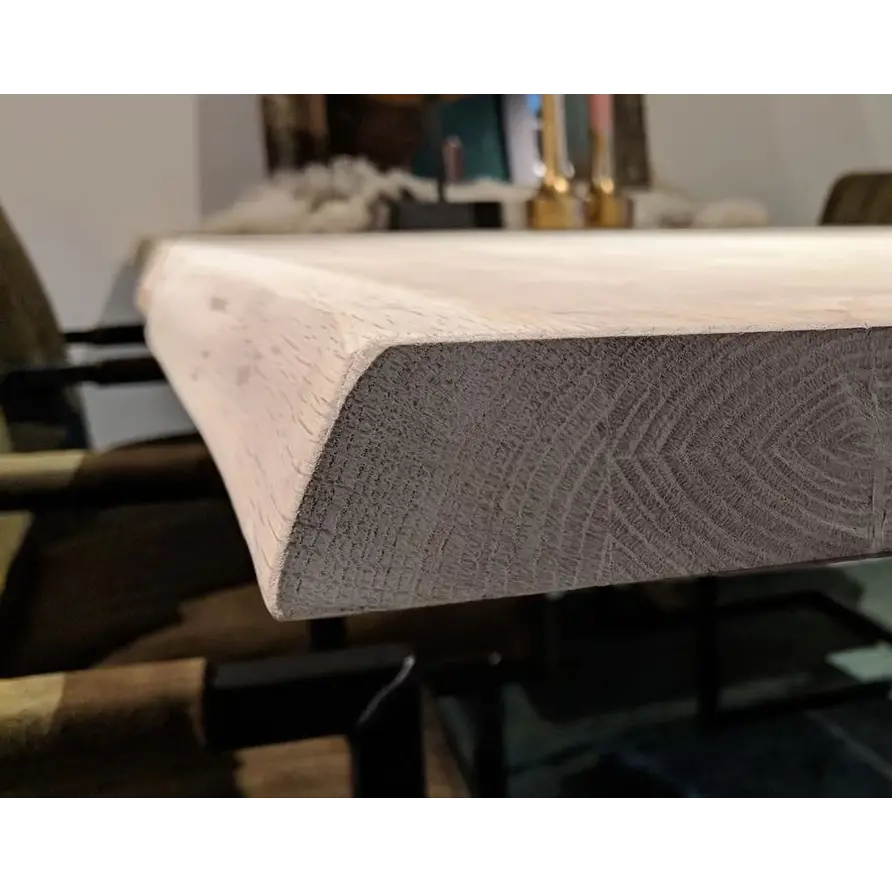 Let op: Door de natuurlijke rand kan de breedte (zoals beschreven bij de productspecificaties) - op bepaalde punten - tot maximaal 10 cm afwijken. Het tafelblad wordt aan de onderzijde standaard voorzien van 2 staalprofielen & (werkings)groeven/sleuven om de kans op werking (vervorming / kromtrekking) te verkleinen, voor een stabiel tafelblad.