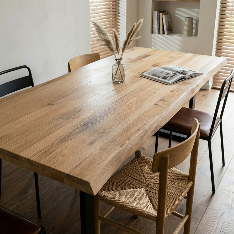 Rustiek eiken (B/C) staat bekend om zijn sfeervolle en warme uitstraling. Het eikenhout is kunstmatig gedroogd (kd) en heeft een vochtpercentage van 8-12%, ideaal voor binnengebruik. Het eiken tafelblad wordt opgebouwd uit doorgaande lamellen in de lengterichting, met een breedte van 4-10 cm, wat een veelvoorkomende lamelbreedte is. Standaard wordt het eiken tafelblad onbehandeld, fijn geschuurd (finish) & met afgeronde randen (2 mm radius) geleverd. Daarnaast bieden wij diverse extra opties om uw tafelblad volledig naar wens af te werken.