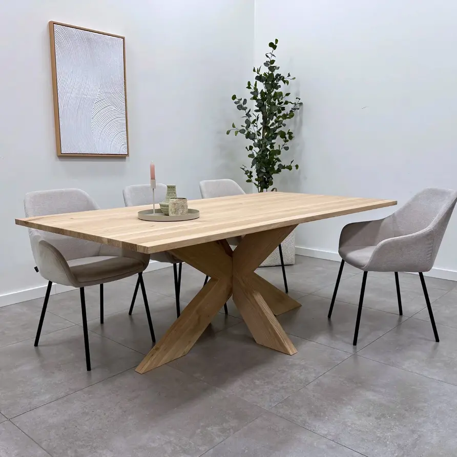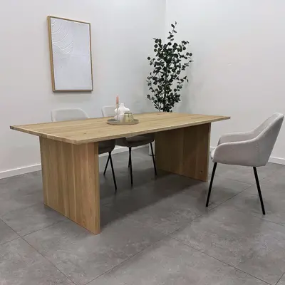 Eiken eettafel - 4 cm dik (massief) - rustiek eikenhout (B/C) - brede lamel (9-12 cm) - ambachtelijk verlijmde tafel - kunstmatig gedroogd (KD) 8-12%. Deze prachtige eiken eetkamertafel van 40 mm dik wordt ambachtelijk gemaakt, met veel zorg & aandacht voor detail, en is verkrijgbaar in diverse vaste maten. Een rechthoekige eiken tafel is praktisch en toegankelijk, met diverse randafwerkingen - zoals ronde hoeken, een verjongde rand of een CNC boomstam rand - voor een uniek accent. Het rustieke eikenhout heeft een B-kwaliteit zichtzijde met noesten en scheuren. Dit zorgt voor een levendig en natuurlijk uiterlijk. Ook bent u bij deze eikenhouten tafel verzekerd van brede lamellen, voor een (extra!) mooie tafel met een luxe accent.