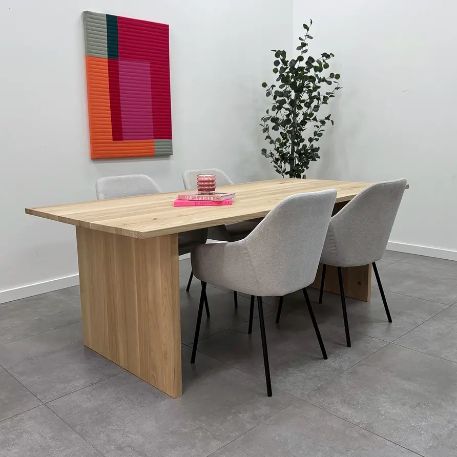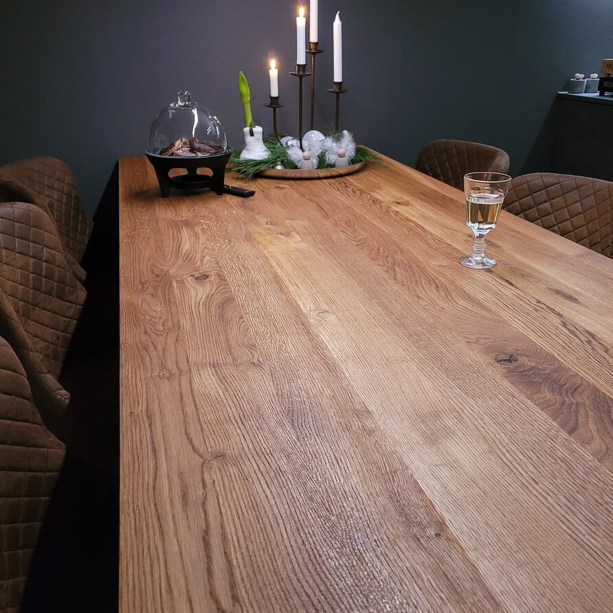 Eiken eettafel - op maat - 4 cm dik (massief) - rustiek eikenhout (B/C) - brede lamel (9-12 cm) - ambachtelijk verlijmde tafel - kunstmatig gedroogd (KD) 8-12%. Deze prachtige eikenhouten eettafel van 40 mm dik wordt ambachtelijk op maat gemaakt, met veel zorg & aandacht voor detail. Een rechthoekige eiken tafel is praktisch en toegankelijk, met diverse randafwerkingen - zoals ronde hoeken, een verjongde rand of een CNC boomstam rand - voor een uniek accent. Het rustieke eikenhout heeft een B-kwaliteit zichtzijde met noesten en scheuren. Dit zorgt voor een levendig en natuurlijk uiterlijk. Ook bent u bij deze eikenhouten tafel verzekerd van brede lamellen, voor een (extra!) mooie tafel met een luxe accent.