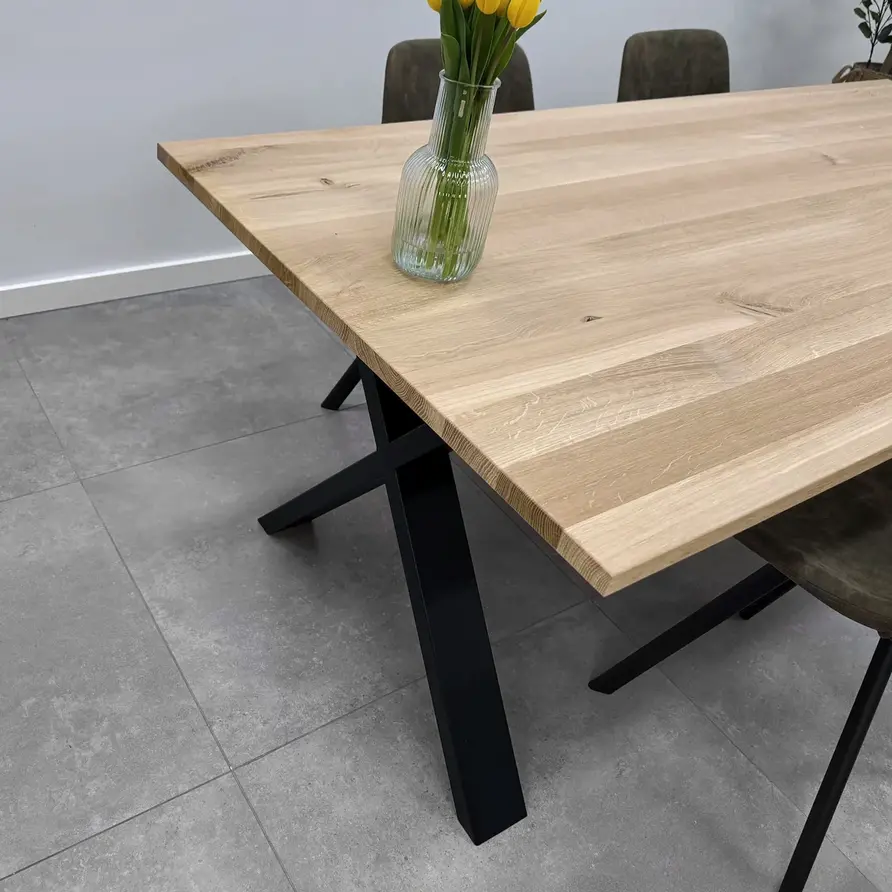 Rustiek eiken (B/C) staat bekend om zijn sfeervolle en warme uitstraling. Het eikenhout is kunstmatig gedroogd (kd) en heeft een vochtpercentage van 8-12%, ideaal voor binnengebruik. Het eiken tafelblad wordt opgebouwd uit doorgaande lamellen in de lengterichting, met een breedte van 9-12 cm, oftewel speciale brede lamellen! Standaard wordt het blad onbehandeld, fijn geschuurd (finish) & met afgeronde randen (2 mm radius) geleverd. Daarnaast bieden wij diverse extra opties om uw tafelblad volledig naar wens af te werken.
