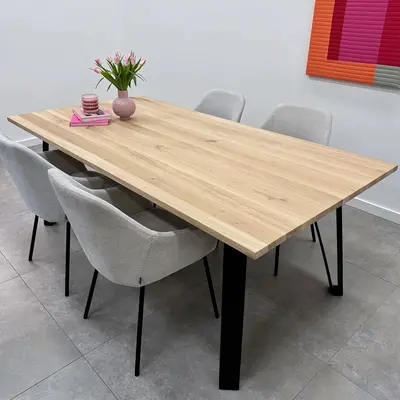 Een prachtige eiken eettafel - van sfeervol rustiek eikenhout en 4 cm dik - dat ambachtelijk met de hand op maat wordt gemaakt. Optioneel met diverse randopties & met een uitgebreide collectie bijpassende tafelpoten & onderstellen. Configureer naar wens! Lees meer