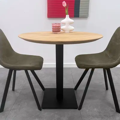 Eiken bistrotafel - rond - 2,7 cm dik (massief) - rustiek eikenhout (B/C) - brede lamel (9-12 cm) - ambachtelijk verlijmde horeca tafel - kunstmatig gedroogd (KD) 8-12%. Deze prachtige ronde eiken bistrotafel van 27 mm dik wordt ambachtelijk gemaakt, met veel zorg & aandacht voor detail, en is verkrijgbaar in diverse vaste maten. Een ronde eiken bistro tafel is gezellig, praktisch en ruimtebesparend, perfect voor in de horeca, maar ook voor thuis! Het rustieke eikenhout heeft een B-kwaliteit zichtzijde met noesten en scheuren. Dit zorgt voor een levendig en natuurlijk uiterlijk. Ook bent u bij deze eikenhouten tafel verzekerd van brede lamellen, voor een (extra!) mooie tafel met een luxe accent.