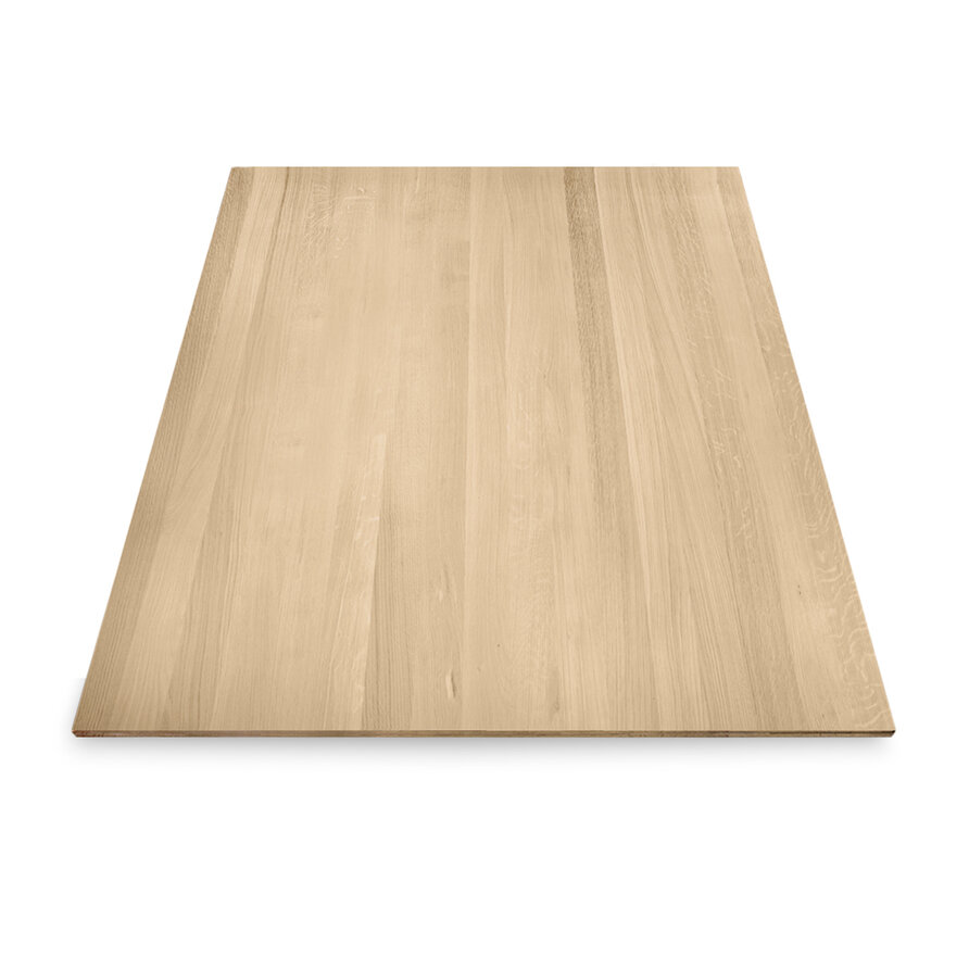 Foutvrij eiken (A/B) staat bekend om zijn sfeervolle en luxe uitstraling. Het eikenhout is kunstmatig gedroogd (kd) en heeft een vochtpercentage van 8-12%, ideaal voor binnengebruik. De boven- & onderzijde van het eiken paneel worden opgebouwd uit doorgaande lamellen in de lengterichting, met een breedte van circa 7 cm, een mooie lamelbreedte. Het middendeel bestaat uit smallere lamellen. Standaard wordt het eiken meubel/timmer paneel onbehandeld, fijn geschuurd (finish) & met scherpe randen geleverd.