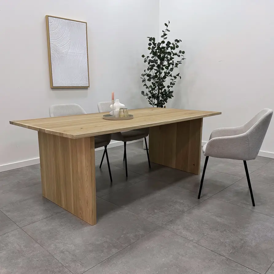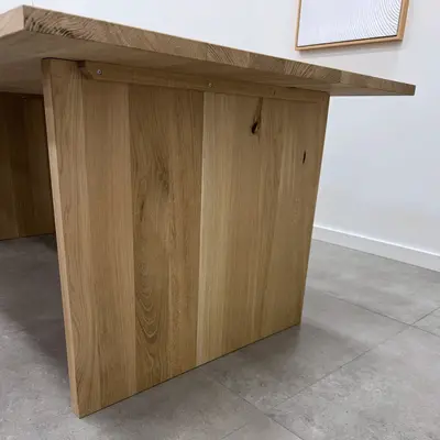 Het eikenhout is kunstmatig gedroogd (kd) en heeft een vochtpercentage van 8-12%, ideaal voor binnengebruik. De eiken tafelpoot wordt opgebouwd uit doorgaande lamellen in de "hoogterichting", vergelijkbaar met een tafelblad. Standaard wordt de tafelpoot onbehandeld geleverd. Deze tafelpoten hebben aan beide zijden een stevige eiken montagelat (circa 3x3 cm) met voorgeboorde gaten, wat zorgt voor een eenvoudige bevestiging op de door u gewenste positie. De latjes zijn aan beide zijden circa 5 cm smaller dan de poot zelf en afgeschuind, zodat ze minder opvallen. De onderzijde van de tafelpoot is vlak, daarom adviseren we het gebruik van meubelvilt of plakvilt voor extra bescherming.
