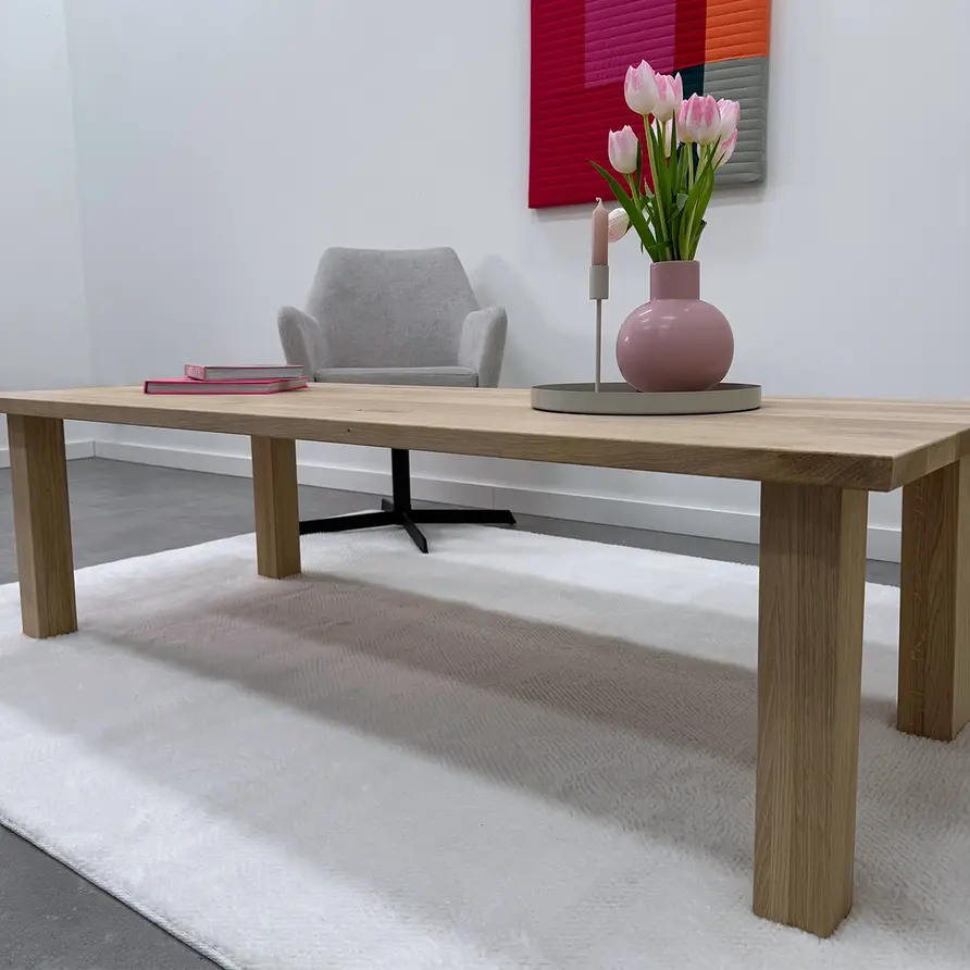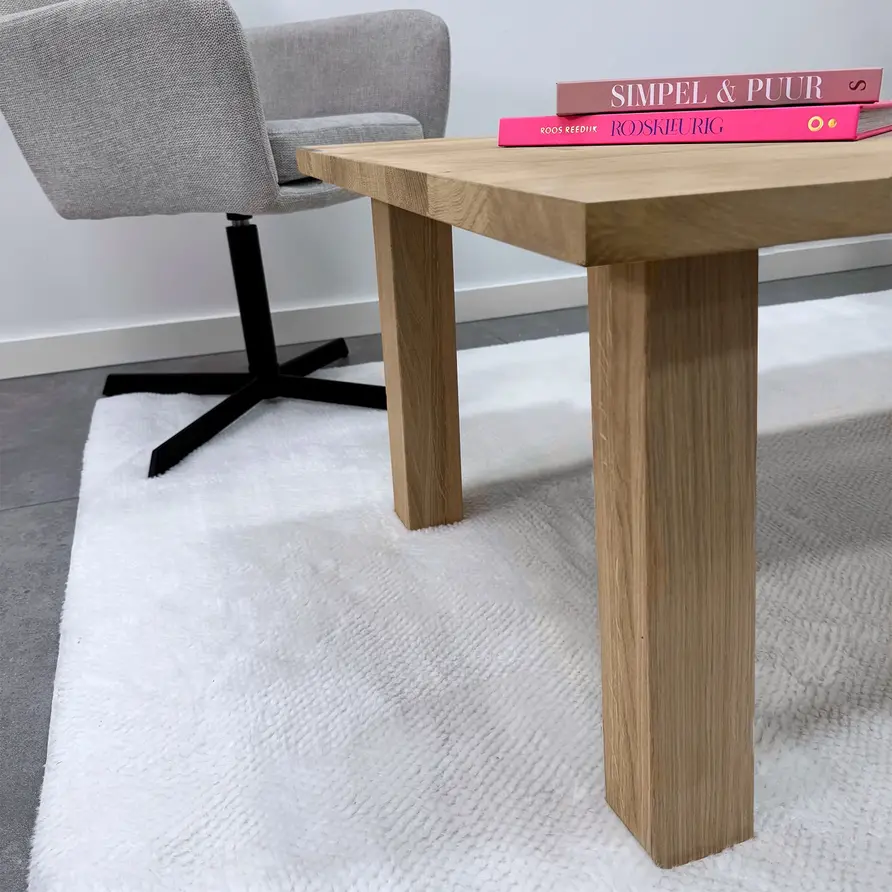 Prachtige eikenhouten blokpotern van foutvrij eikenhout, ideaal voor een sfeervolle salontafel. Deze mooie eiken poot wordt ambachtelijk gemaakt, met veel zorg & aandacht voor detail. De toegankelijke blok vorm, de subtiele 7x7 cm "balkmaat" en de warme uitstraling van het eikenhout zorgen voor een mooie eiken tafel poot, erg populair in combinatie met onze eiken tafelbladen. Het foutvrije eikenhout heeft een A-kwaliteit zichtzijde, wat betekent dat er praktisch geen noesten en scheuren aanwezig zijn. Dit zorgt voor een stijlvol en elegant uiterlijk. De poten worden als set van vier stuks geleverd, en de weergegeven prijs is altijd de setprijs.
