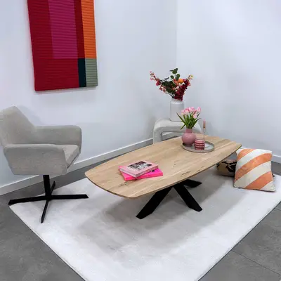 Een moderne eiken salontafel - Deens ovaal, van sfeervol rustiek eikenhout en 4 cm dik - verkrijgbaar in verschillende (vaste) afmetingen. Optioneel met verjongde rand & met een prachtige collectie bijpassende onderstellen. Configureer naar wens! Lees meer
