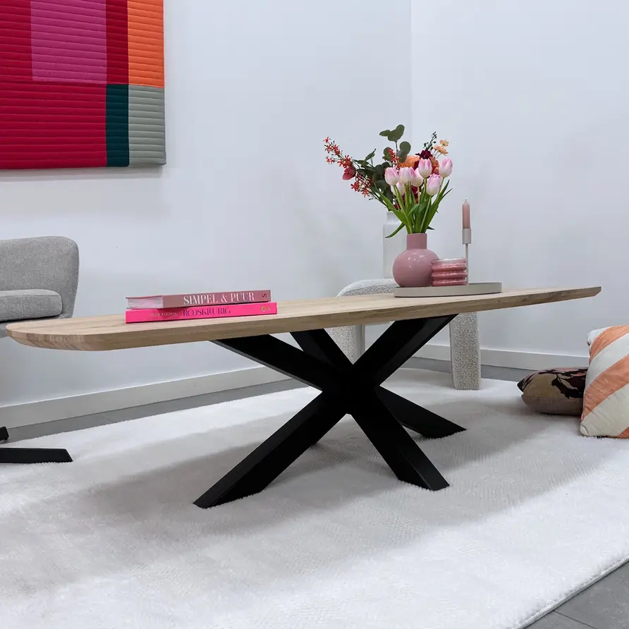 Op basis van uw afmetingen tonen wij een prachtige collectie bijpassende salontafel onderstellen, voor een unieke, complete eikenhouten salontafel. Let op: een tafel Deens ovaal loopt aan de uiteinden smaller toe. Daarom adviseren wij een (centraal) onderstel. Toch liever losse salontafel poten? Dat kan - wij bieden een unieke collectie - maar houd dan circa 15-20 cm extra marge aan bij de minimale breedte van de tafelpoot.
