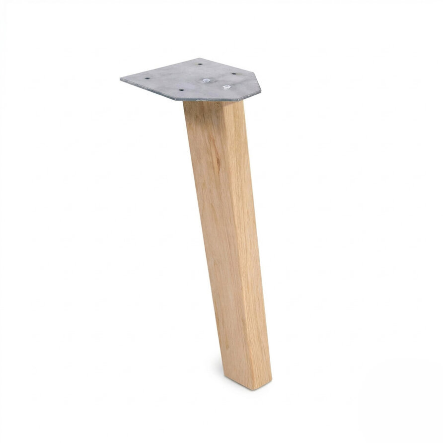 Prachtige schuine & tapse eiken salontafelpoten - 38,5 cm hoog - geschikt voor een eiken salontafel (3 poten). Een sfeervolle & trendy schuine salontafel poot van rustiek eikenhout - inclusief stalen montageplaat - met een moderne look. Lees meer