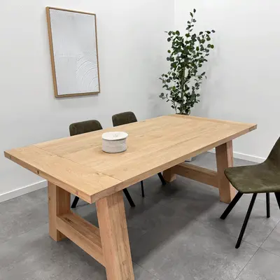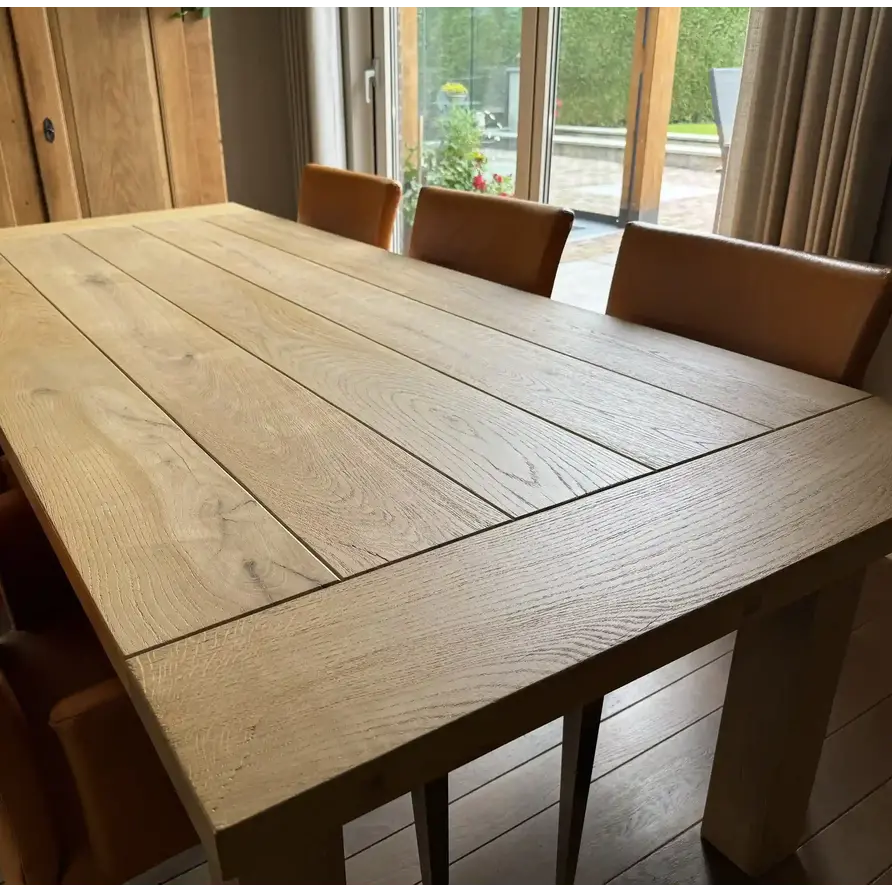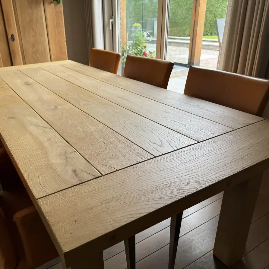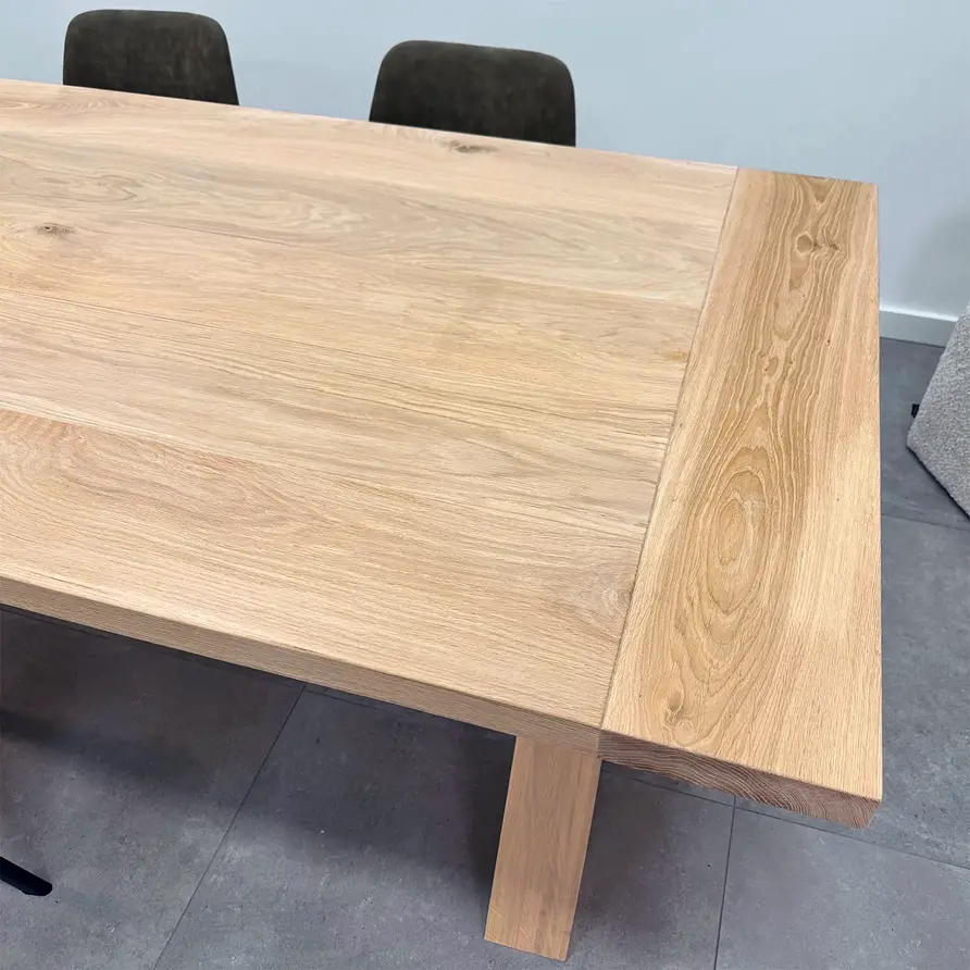 Een eiken tafelblad met dwarse lamel uiteinden - van sfeervol geborsteld rustiek eikenhout en 4,5 cm dik - in verschillende (vaste) afmetingen. Een bijzonder verlijmd tafelblad met XL lamellen + V-groeven, naar wens te configureren! Lees meer