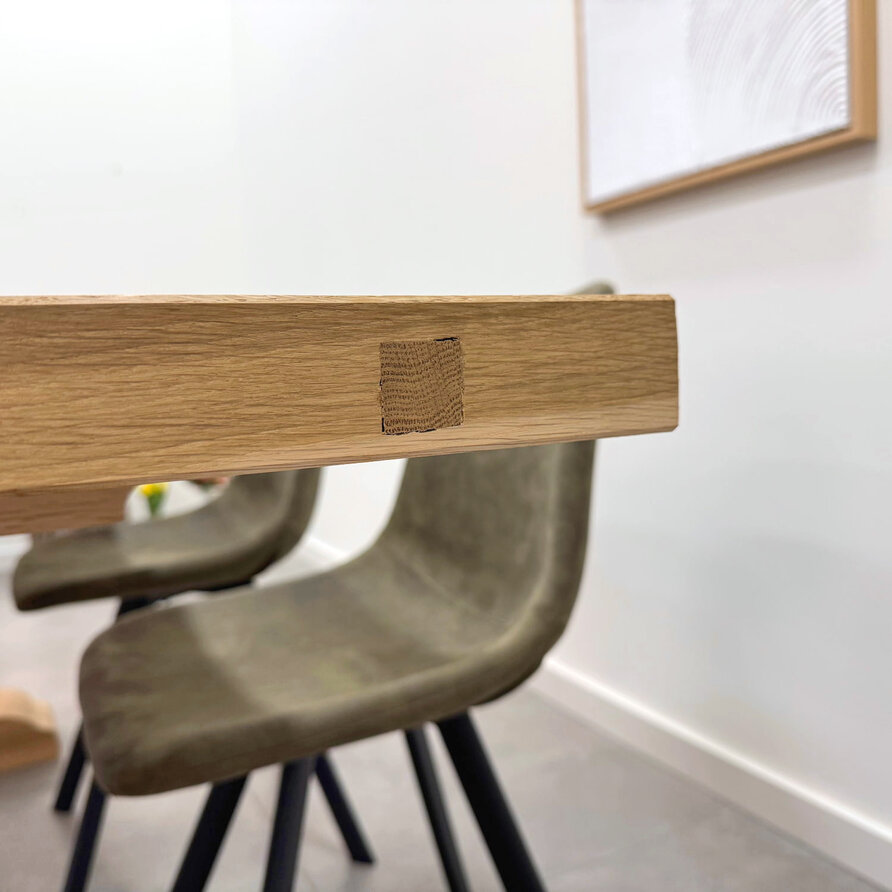 Let op: Het is - door de ruwe geborstelde afwerking - niet mogelijk om te kiezen voor de optie "noesten vullen". Het is niet mogelijk om dit tafelblad te voorzien van staalprofielen. De lamellen worden aan elkaar verbonden middels een speciale "pen & gat" verbinding.