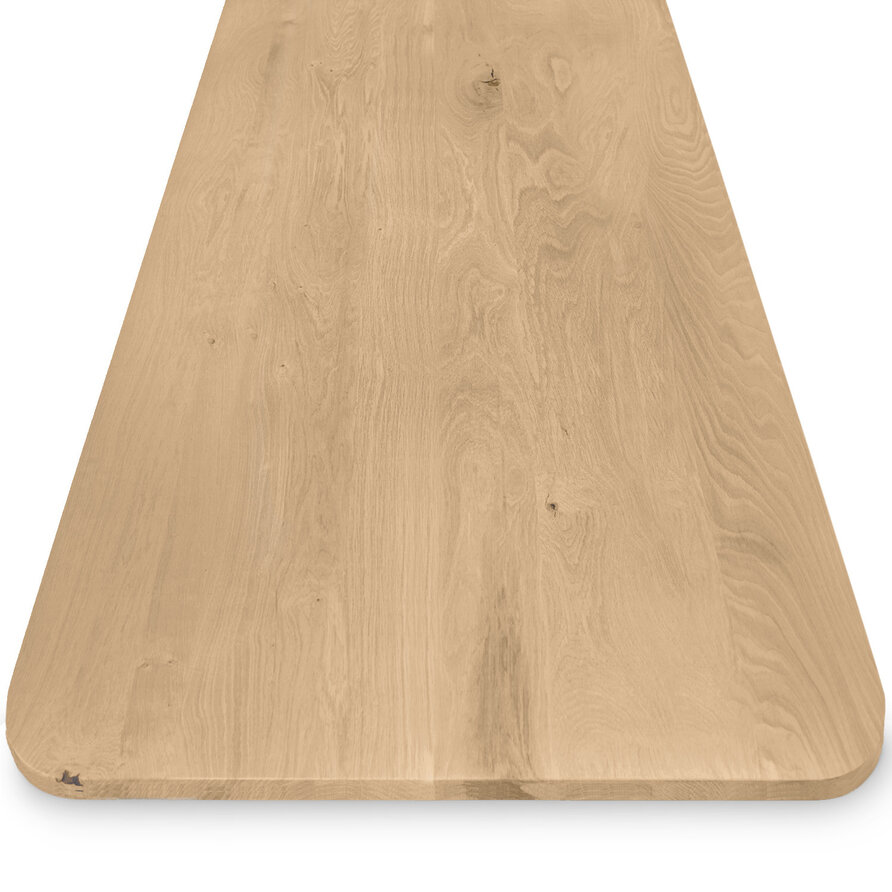 Een eiken tafelblad met ronde hoeken - van sfeervol rustiek eikenhout en 2,7 cm dik - in verschillende (vaste) afmetingen. Een prachtig verlijmd tafelblad met een modern accent & luxe brede lamel, optioneel met verjongde rand. Configureer naar wens! Lees meer