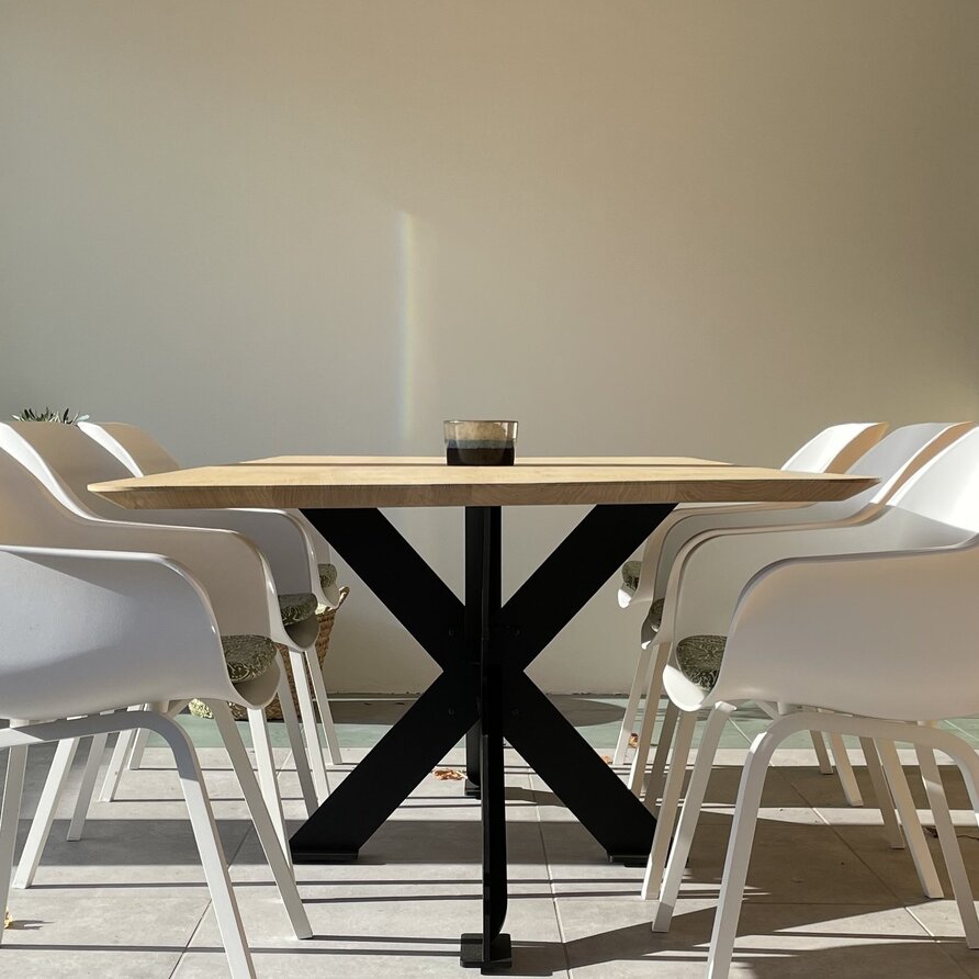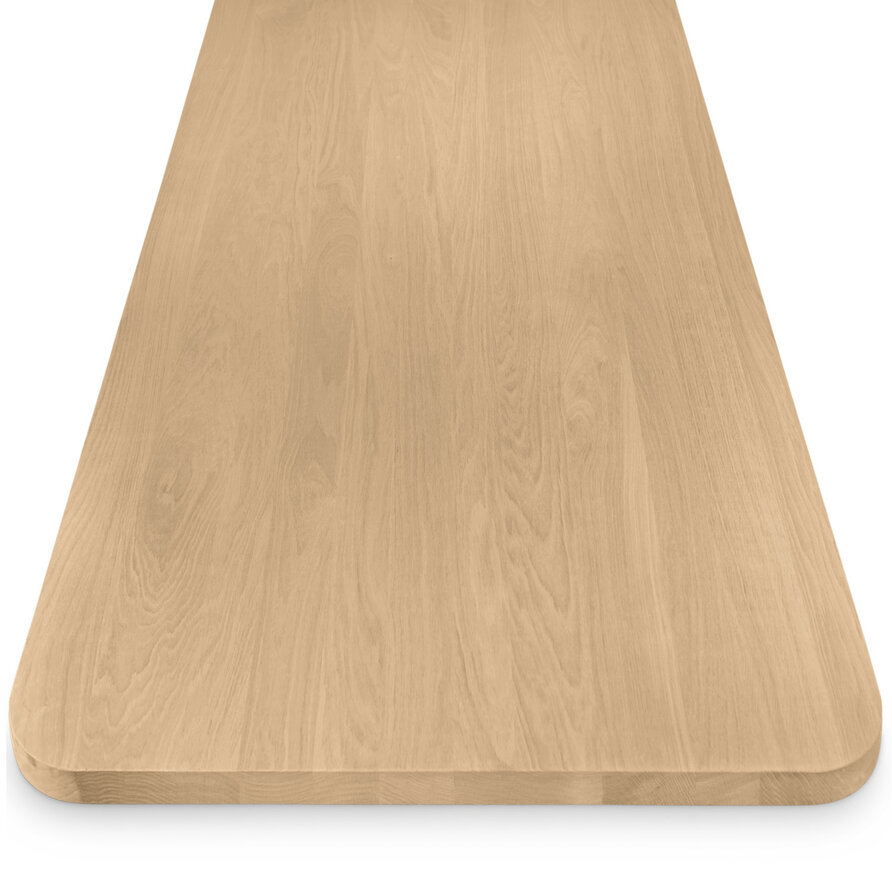 Een eiken tafelblad met ronde hoeken - van stijlvol foutvrij eikenhout en 4 cm dik - in verschillende (vaste) afmetingen. Een prachtig verlijmd tafelblad met een modern accent & luxe brede lamel, optioneel met verjongde rand. Configureer naar wens! Lees meer