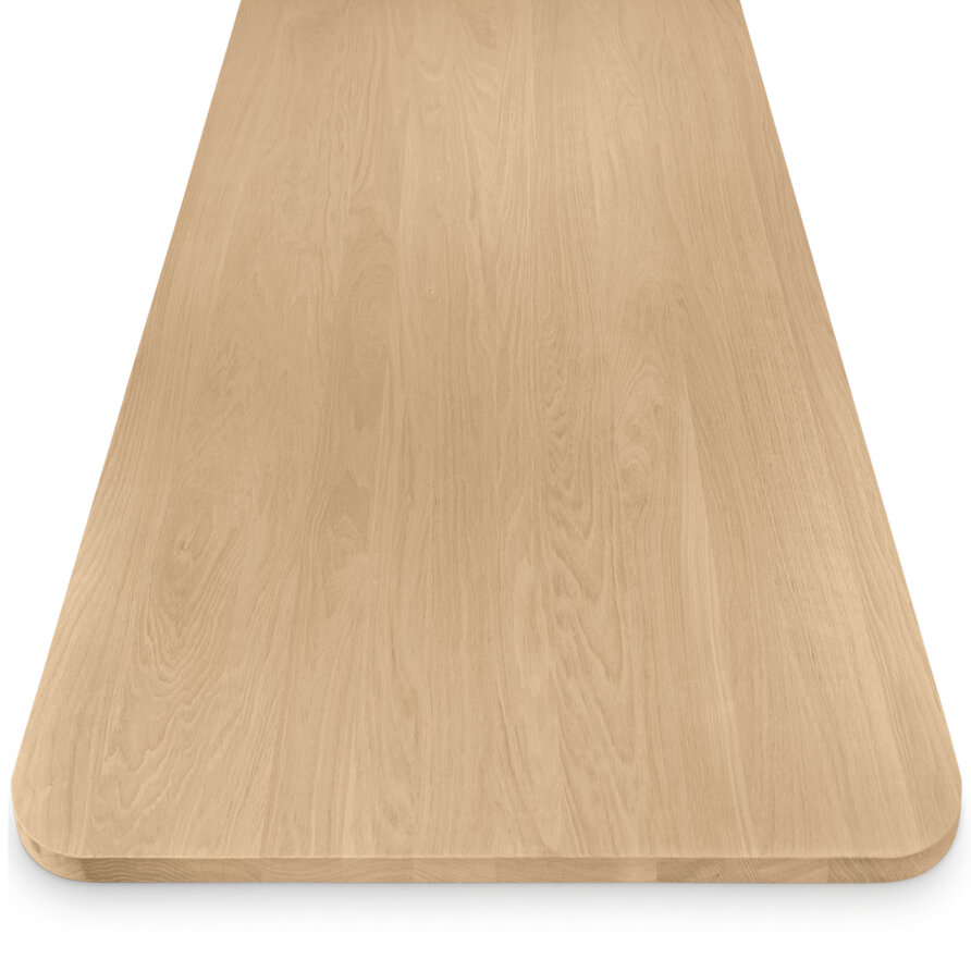 Een eiken tafelblad met ronde hoeken - van stijlvol foutvrij eikenhout en 3 cm dik - dat op maat wordt gemaakt. Een prachtig verlijmd tafelblad (smalle lamel) met een modern accent, optioneel met verjongde rand. Configureer naar wens! Lees meer