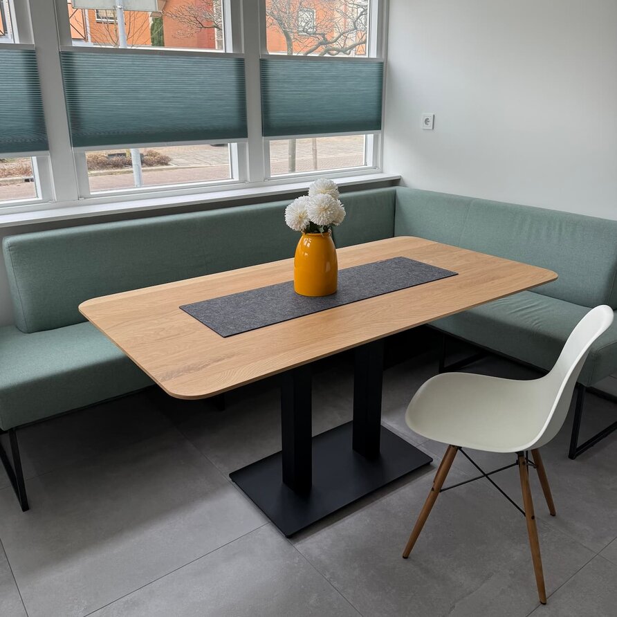 Een eiken tafelblad met ronde hoeken - van stijlvol foutvrij eikenhout en 4 cm dik - dat op maat wordt gemaakt. Een prachtig verlijmd tafelblad (smalle lamel) met een modern accent, optioneel met verjongde rand. Configureer naar wens! Lees meer