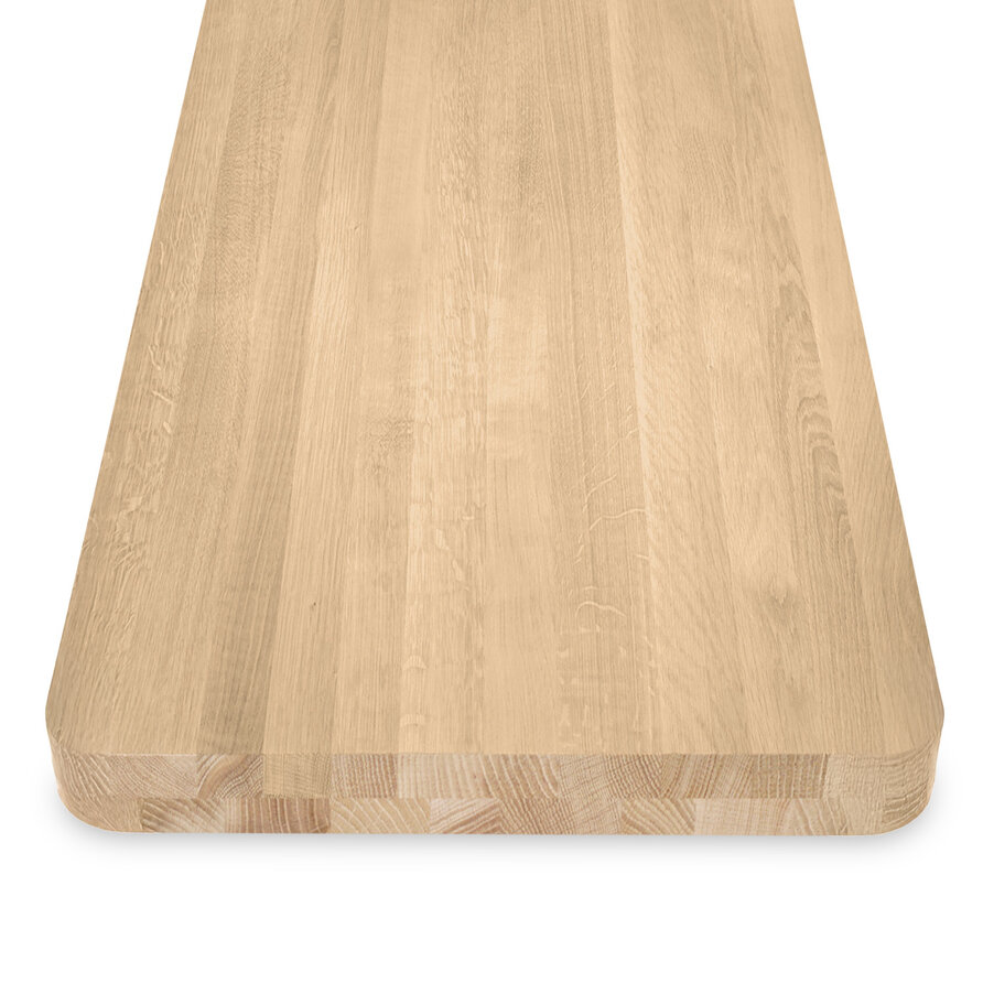 Eiken tafelblad - ronde hoeken - op maat - 8 cm dik - 2-laags massief - foutvrij eikenhout (A/B) - verlijmd, smalle lamel - 80 mm