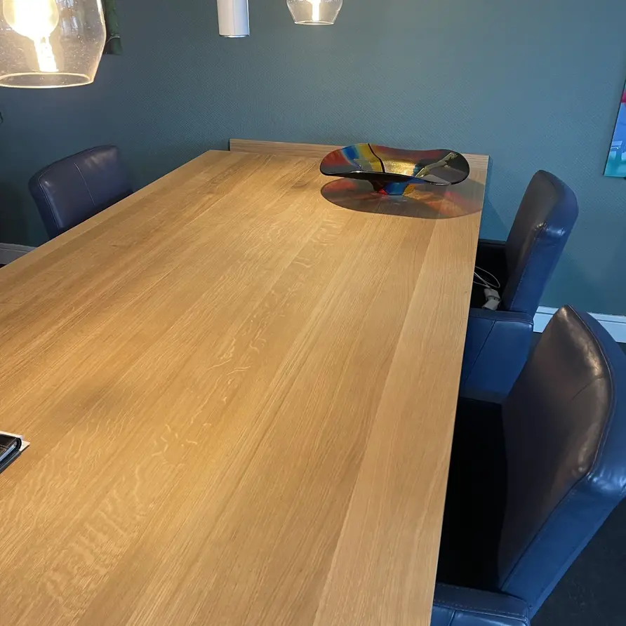 Eiken tafelblad - op maat - 3 cm (massief) - foutvrij eikenhout (A/B) - smalle lamel - ambachtelijk verlijmde maatwerk tafel - kunstmatig gedroogd (KD) 8-12%. Dit mooie eikenhouten tafelblad van 30 mm dik wordt ambachtelijk met de hand op maat gemaakt, met veel zorg & aandacht voor detail. Het foutvrije eikenhout heeft een A-kwaliteit zichtzijde, wat betekent dat er praktisch geen noesten en scheuren aanwezig zijn. Dit zorgt voor een stijlvol en elegant uiterlijk.