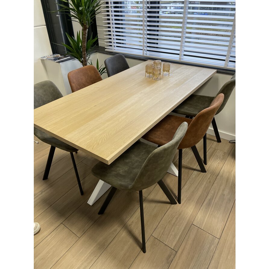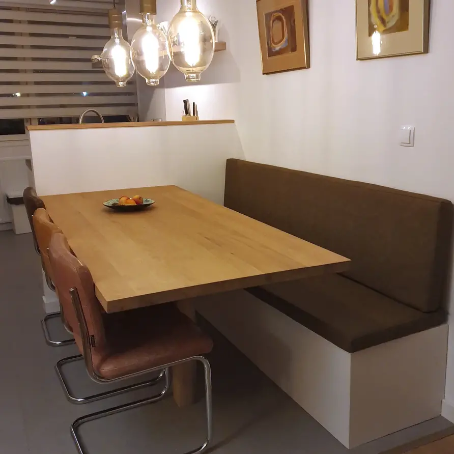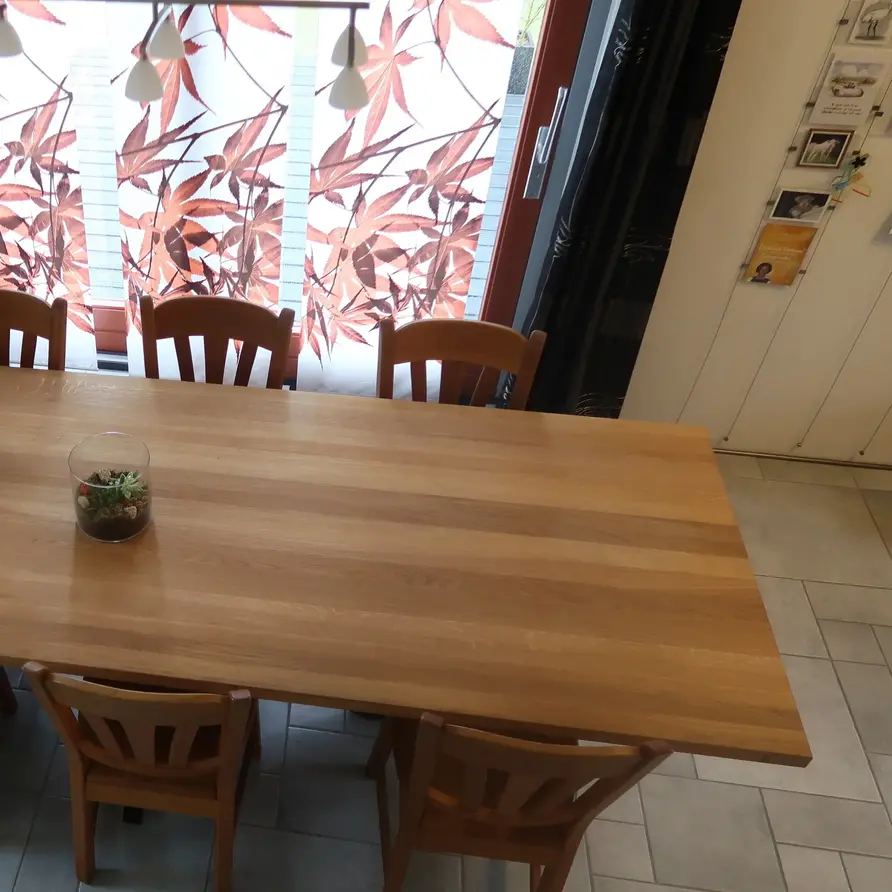 Eiken tafelblad - op maat - 4 cm dik (massief) - foutvrij eikenhout (A/B) - smalle lamel - ambachtelijk verlijmde maatwerk tafel - kunstmatig gedroogd (KD) 8-12%. Dit mooie eikenhouten tafelblad van 40 mm dik wordt ambachtelijk met de hand op maat gemaakt, met veel zorg & aandacht voor detail. Het foutvrije eikenhout heeft een A-kwaliteit zichtzijde, wat betekent dat er praktisch geen noesten en scheuren aanwezig zijn. Dit zorgt voor een stijlvol en elegant uiterlijk.