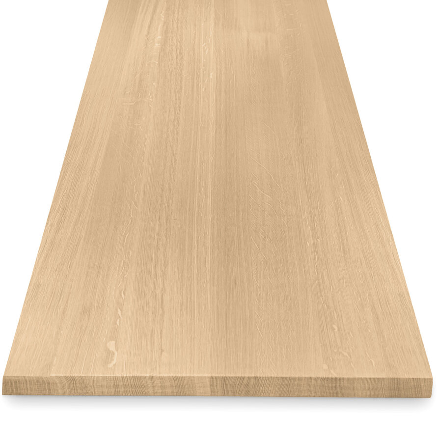 Foutvrij eiken (A/B) staat bekend om zijn sfeervolle en luxe uitstraling. Het eikenhout is kunstmatig gedroogd (kd) en heeft een vochtpercentage van 8-12%, ideaal voor binnengebruik. Het eiken blad wordt opgebouwd uit doorgaande lamellen in de lengterichting, met een breedte van 9-12 cm, oftewel speciale brede lamellen! Standaard wordt het eiken tafelblad onbehandeld, fijn geschuurd (finish) & met afgeronde randen (2 mm radius) geleverd. Daarnaast bieden wij diverse extra opties om uw tafelblad volledig naar wens af te werken.