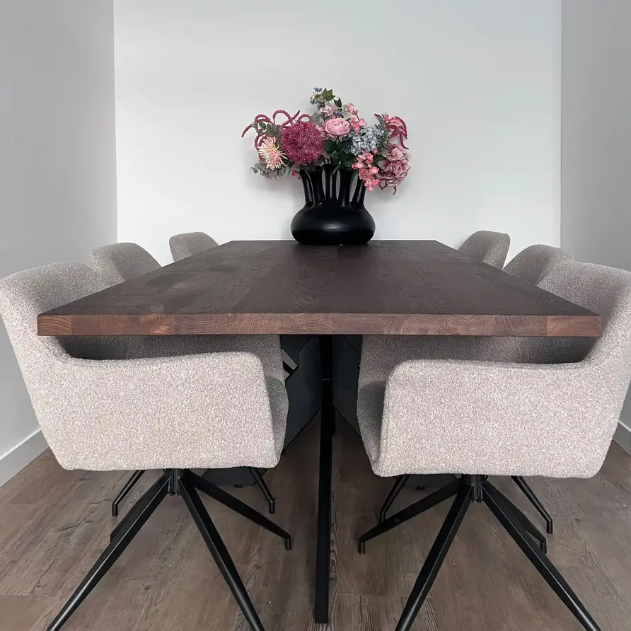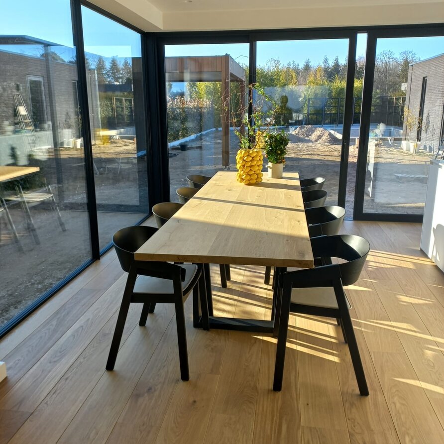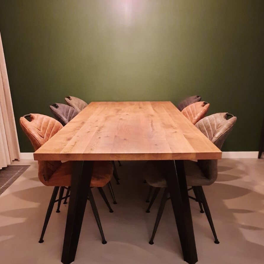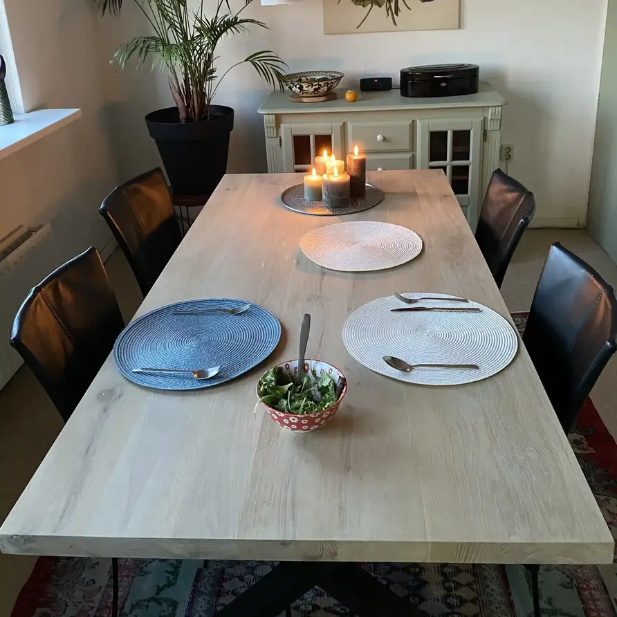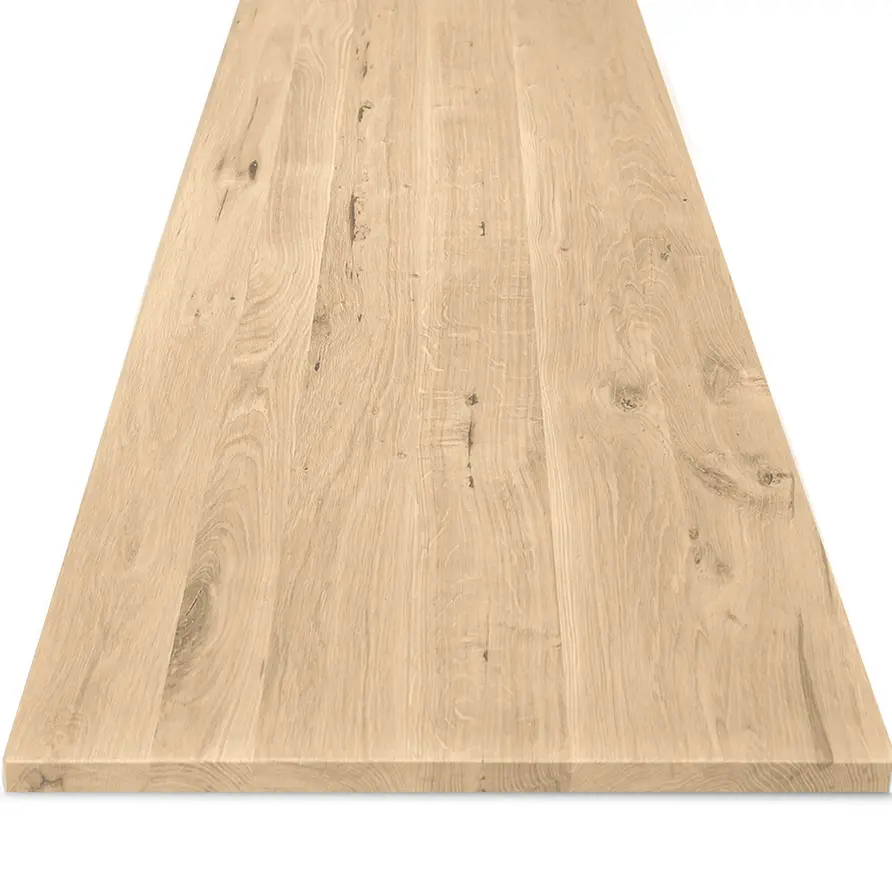 Een eiken tafelblad - van sfeervol rustiek eikenhout en 4 cm dik - dat op maat wordt gemaakt. Een prachtig verlijmd tafelblad met luxe brede lamellen. Diverse randopties, configureer uw vierkante tafelblad compleet naar wens! Lees meer