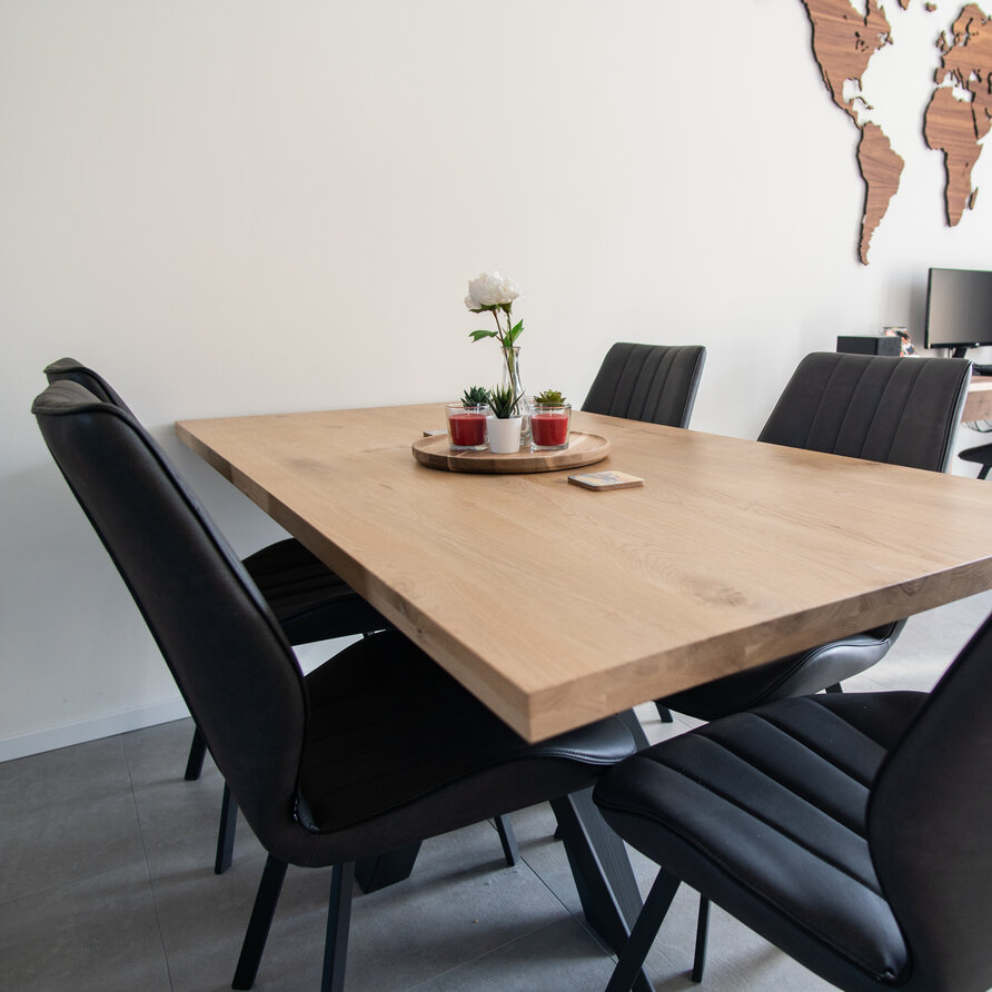 Een eiken tafelblad - van sfeervol rustiek eikenhout en 4 cm dik (massief, 2-laags) - dat op maat wordt gemaakt. Een prachtig verlijmd tafelblad (smalle lamel) met diverse randopties. Configureer uw eikenhouten tafelblad compleet naar wens! Lees meer