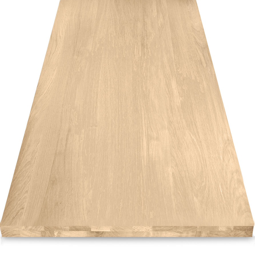 Foutvrij eiken (A/B) staat bekend om zijn sfeervolle en luxe uitstraling. Het eikenhout is kunstmatig gedroogd (kd) en heeft een vochtpercentage van 8-12%, ideaal voor binnengebruik. Het eiken tafelblad wordt opgebouwd uit doorgaande lamellen in de lengterichting, met een breedte van 4-10 cm, wat een veelvoorkomende lamelbreedte is. Standaard wordt het eiken tafelblad onbehandeld, fijn geschuurd (finish) & met afgeronde randen (2 mm radius) geleverd. Daarnaast bieden wij diverse extra opties om uw tafelblad volledig naar wens af te werken.