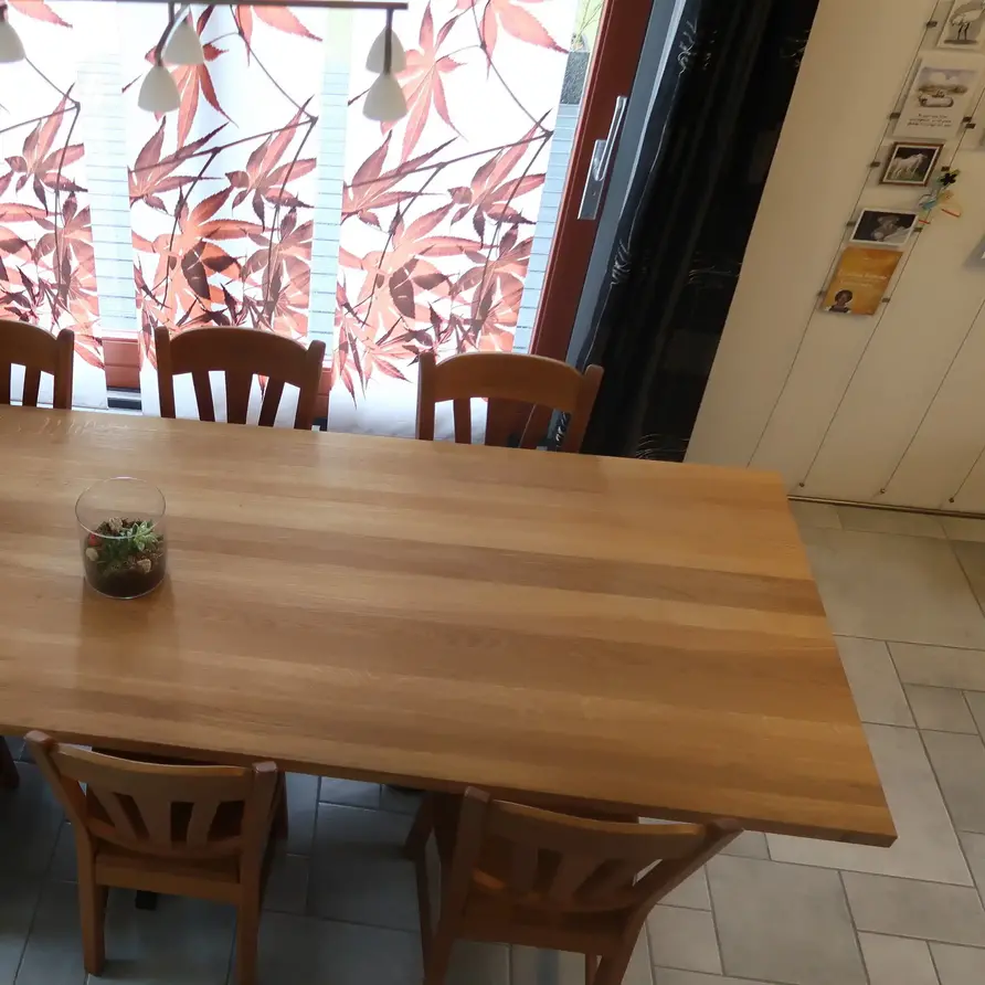 Een eiken tafelblad - van stijlvol foutvrij eikenhout en 4 cm dik, 2-laags rondom opgedikt - dat op maat wordt gemaakt. Een prachtig verlijmd tafelblad (smalle lamel) & zeer toegankelijk. Diverse randopties, configureer uw tafelblad compleet naar wens! Lees meer