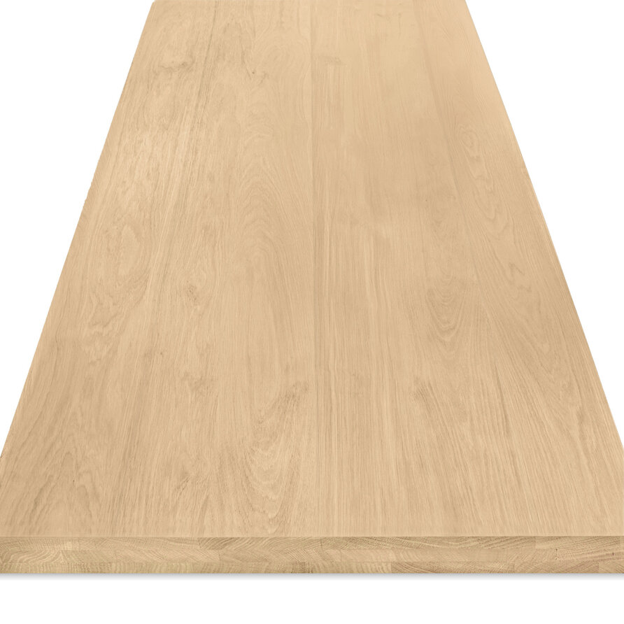 Foutvrij eiken (A/B) staat bekend om zijn sfeervolle en luxe uitstraling. Het eikenhout is kunstmatig gedroogd (kd) en heeft een vochtpercentage van 8-12%, ideaal voor binnengebruik. Het eiken tafelblad wordt opgebouwd uit doorgaande lamellen in de lengterichting, met een breedte van 4-10 cm, wat een veelvoorkomende lamelbreedte is. Standaard wordt het eiken tafelblad onbehandeld, fijn geschuurd (finish) & met afgeronde randen (2 mm radius) geleverd. Daarnaast bieden wij diverse extra opties om uw tafelblad volledig naar wens af te werken.