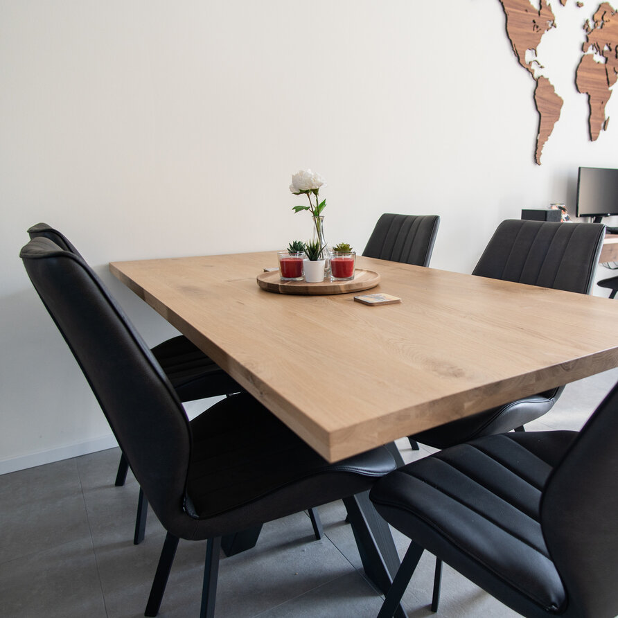 Rustiek eiken (B/C) staat bekend om zijn sfeervolle en warme uitstraling. Het eikenhout is kunstmatig gedroogd (kd) en heeft een vochtpercentage van 8-12%, ideaal voor binnengebruik. Het eiken tafelblad wordt opgebouwd uit doorgaande lamellen in de lengterichting, met een breedte van 4-10 cm, wat een veelvoorkomende lamelbreedte is. Standaard wordt het eiken tafelblad onbehandeld, fijn geschuurd (finish) & met afgeronde randen (2 mm radius) geleverd. Daarnaast bieden wij diverse extra opties om uw tafelblad volledig naar wens af te werken.
