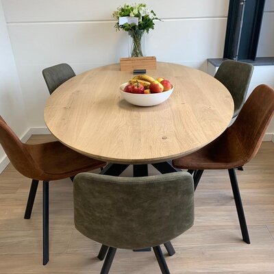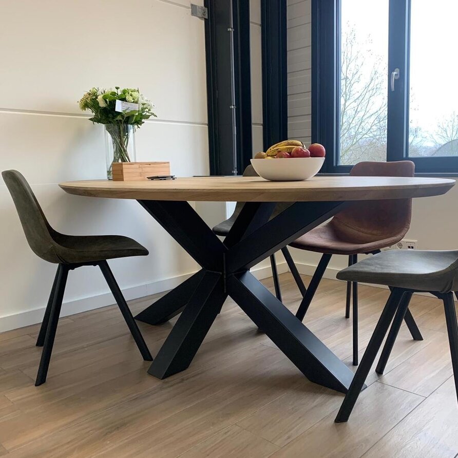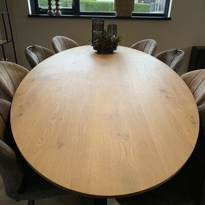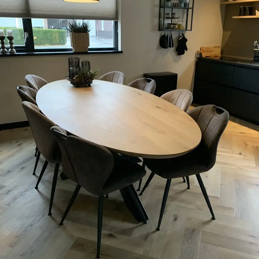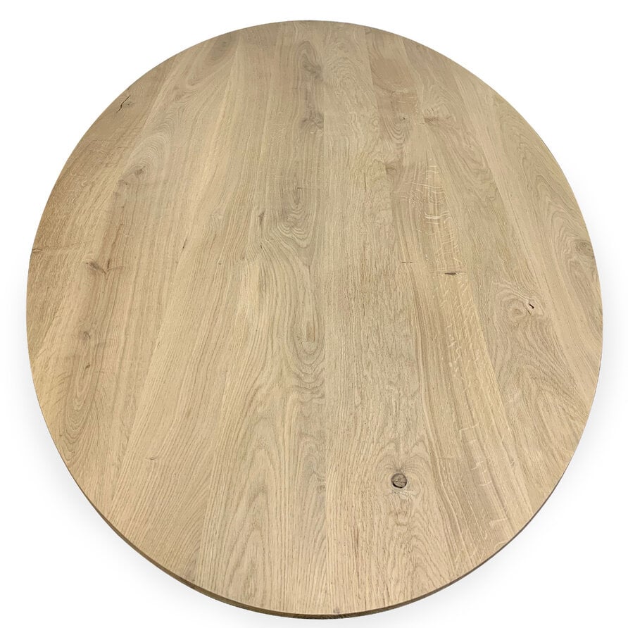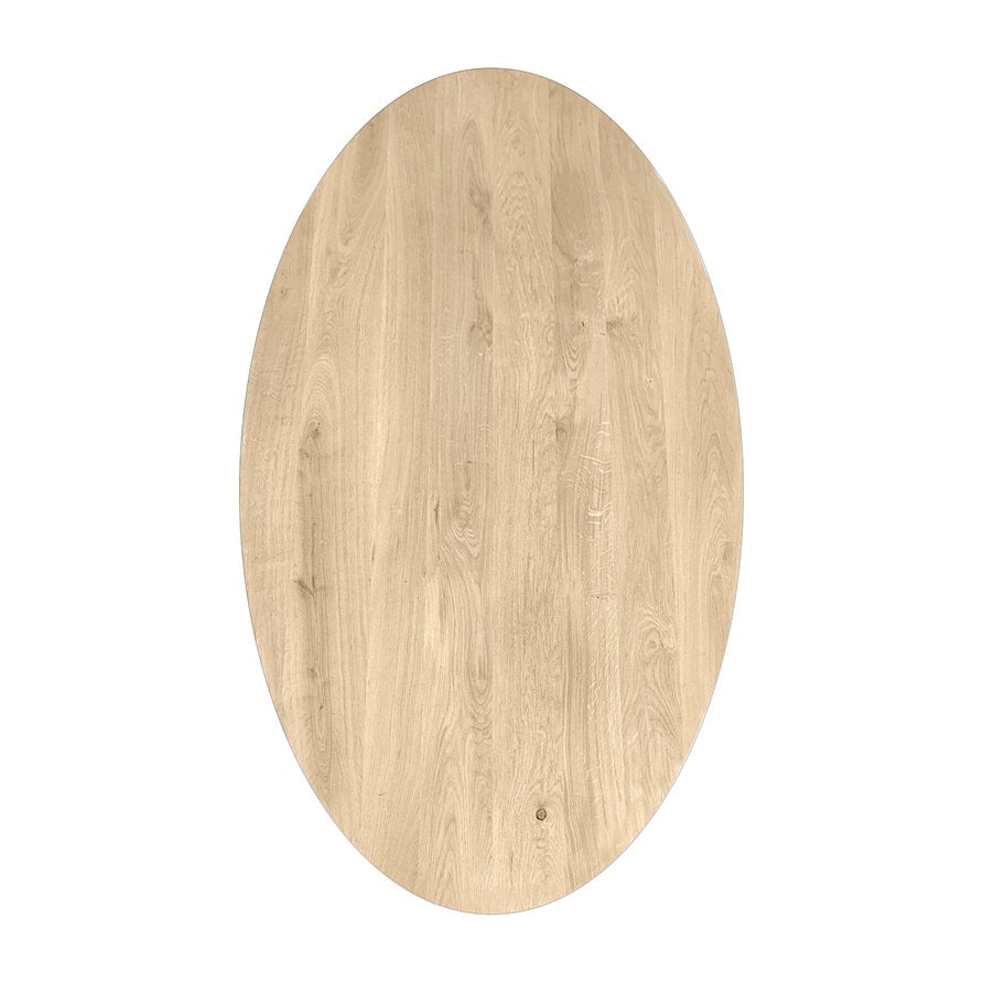 Een ovaal eiken tafelblad met verjongde rand - van sfeervol rustiek eikenhout en 2,8 cm dik - in verschillende (vaste) afmetingen. Een prachtig verlijmd ellips tafelblad (medium lamel) met elegante uitstraling, naar wens te configureren! Lees meer