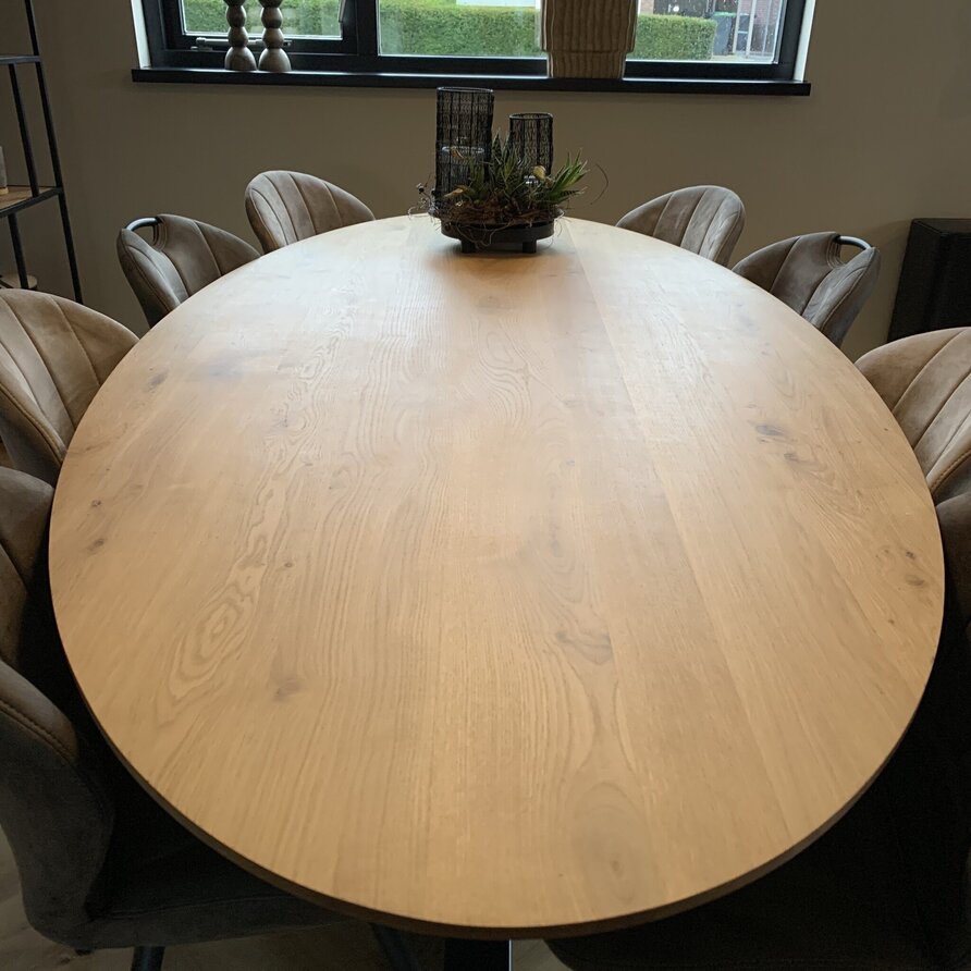 Een ovaal eiken tafelblad met verjongde rand - van sfeervol rustiek eikenhout en 4 cm dik - in verschillende (vaste) afmetingen. Een prachtig verlijmd ellips tafelblad (medium lamel) met elegante uitstraling, naar wens te configureren! Lees meer