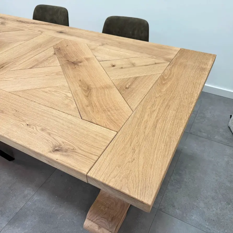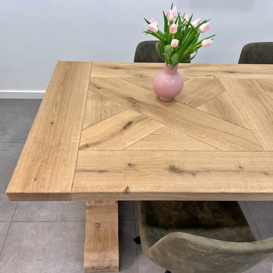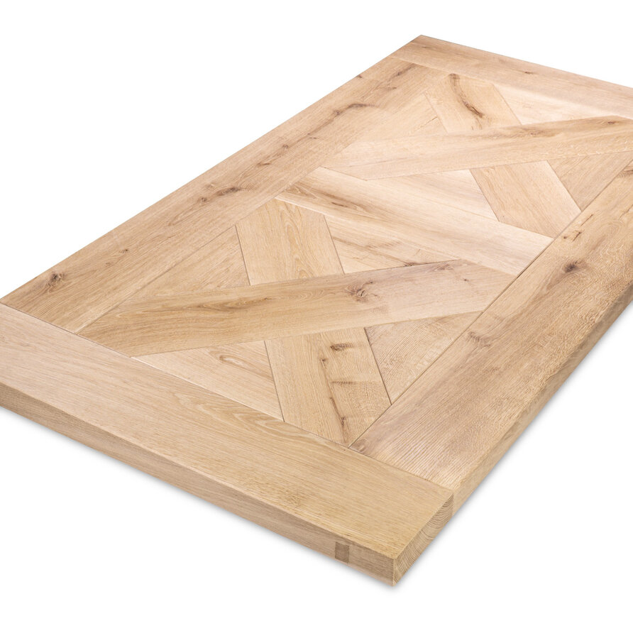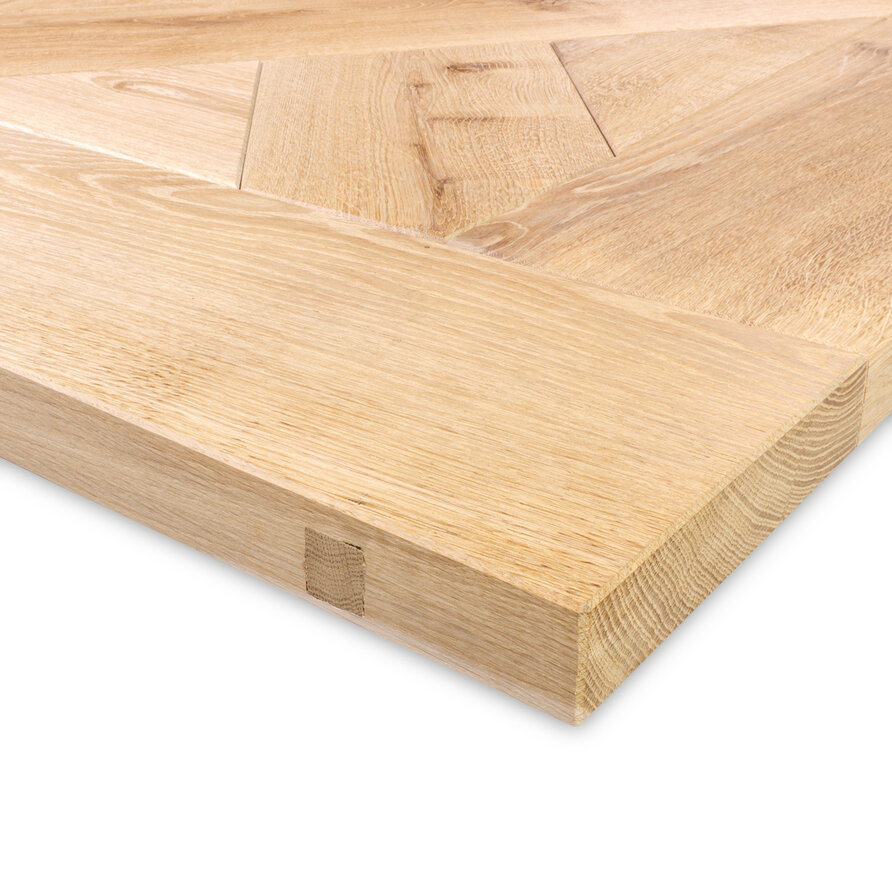 Een eiken tafelblad met dubbel kruis patroon & dwarse lamel uiteinden - van sfeervol geborsteld rustiek eikenhout en 4,5 cm dik - in verschillende (vaste) afmetingen. Een bijzonder verlijmd tafelblad met XL lamellen + V-groeven, naar wens te configureren! Lees meer