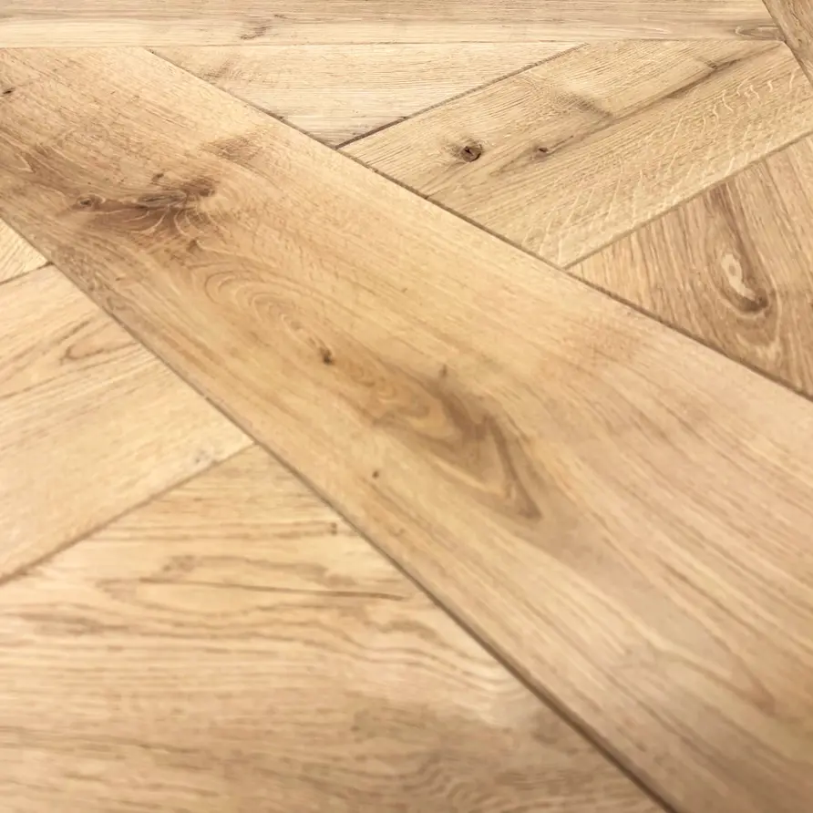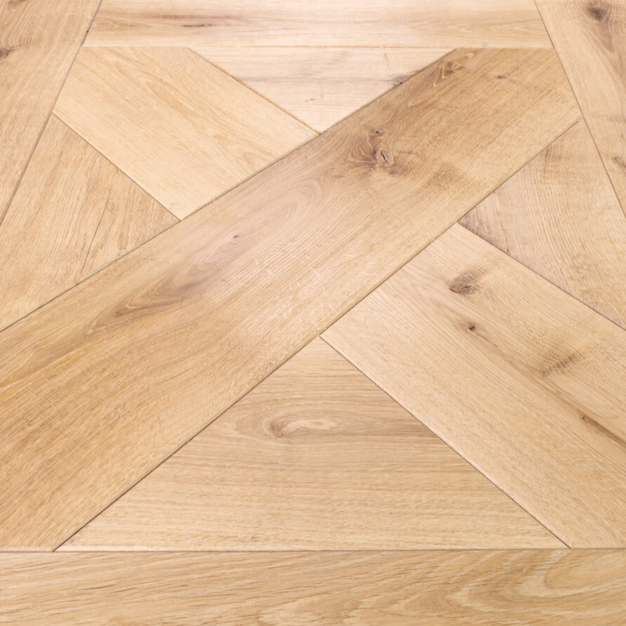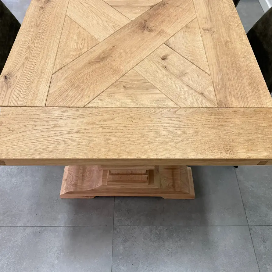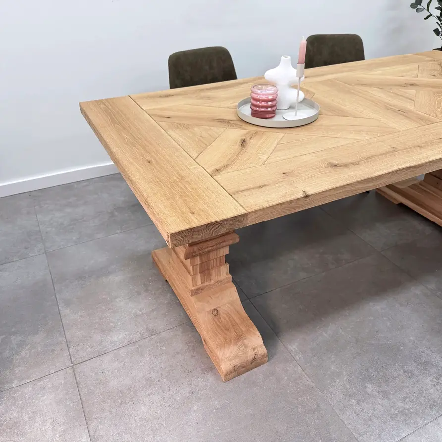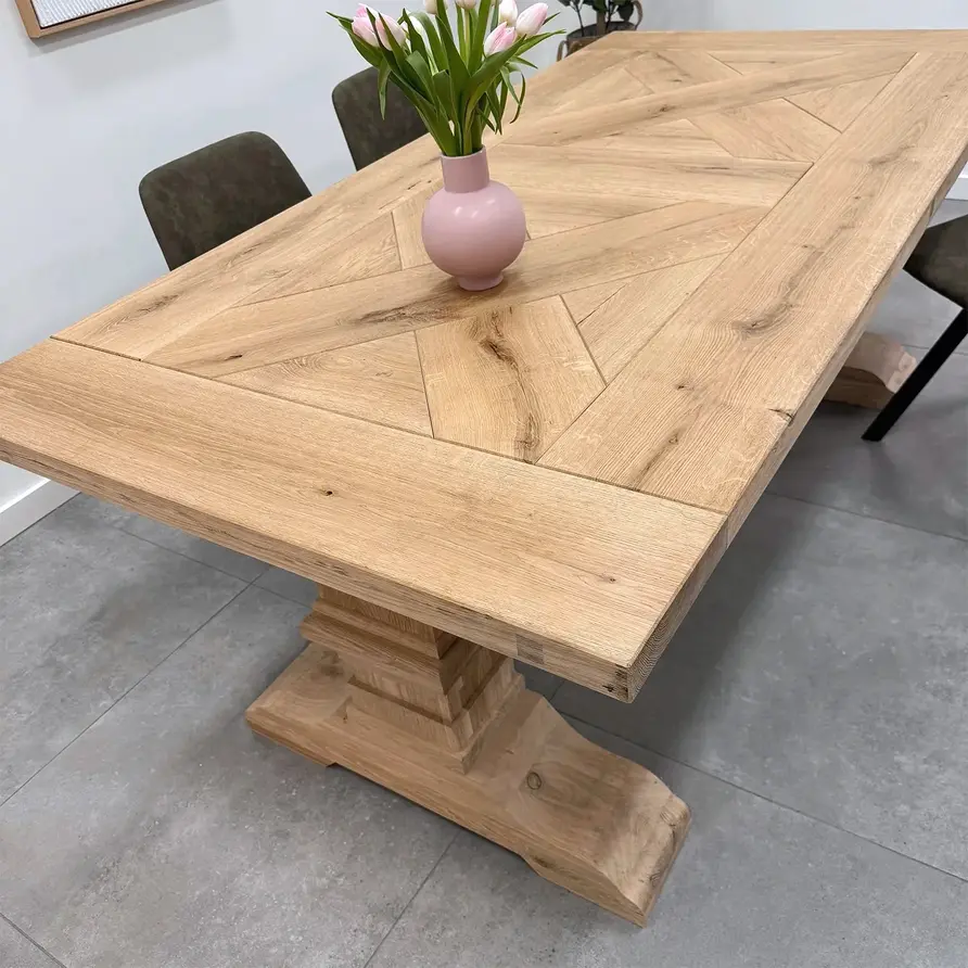 Een eiken tafelblad met dubbel kruis patroon & dwarse lamel uiteinden - van sfeervol geborsteld rustiek eikenhout en 4,5 cm dik - in verschillende (vaste) afmetingen. Een bijzonder verlijmd tafelblad met XL lamellen + V-groeven, naar wens te configureren! Lees meer