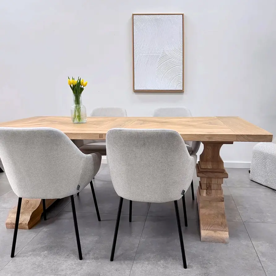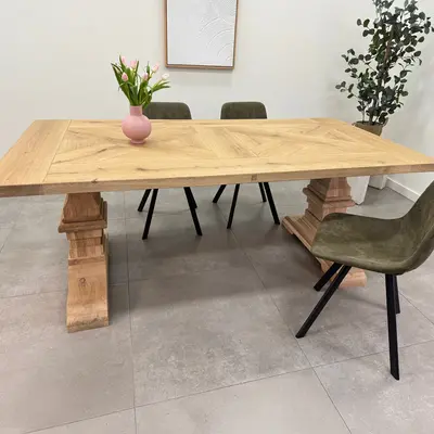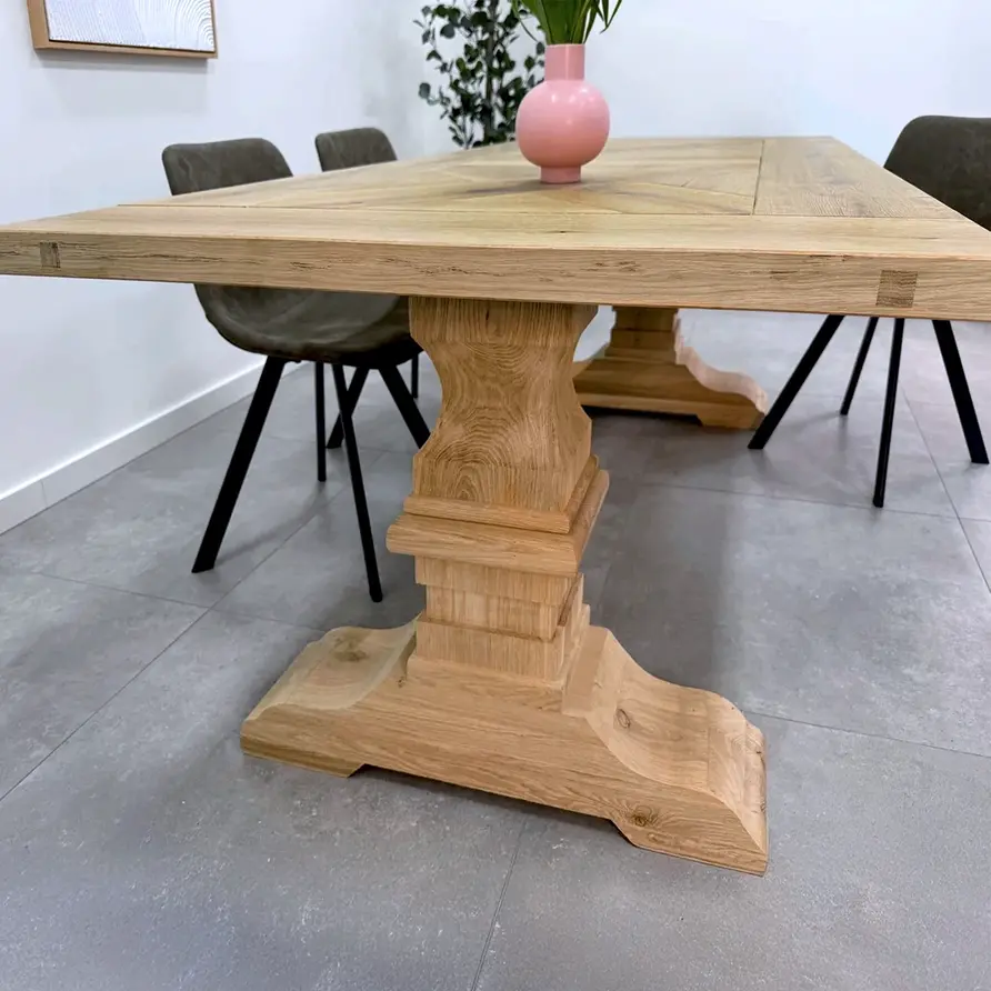 Rustiek eiken (B/C) staat bekend om zijn sfeervolle en warme uitstraling. Het eikenhout is kunstmatig gedroogd (kd) en heeft een vochtpercentage van 8-12%, ideaal voor binnengebruik. Het eiken blad wordt opgebouwd uit doorgaande lamellen (in de lengterichting), met een breedte van circa 20 cm, oftewel speciale brede XL lamellen! Hierbij worden er V-groeven tussen de lamellen aangebracht, voor een extra stijlvol accent. Standaard wordt het eiken tafelblad onbehandeld, geborsteld & met scherpe randen geleverd. Als u kiest voor een behandeling, worden de randen automatisch afgerond. Daarnaast bieden wij diverse extra opties om uw tafelblad volledig naar wens af te werken.