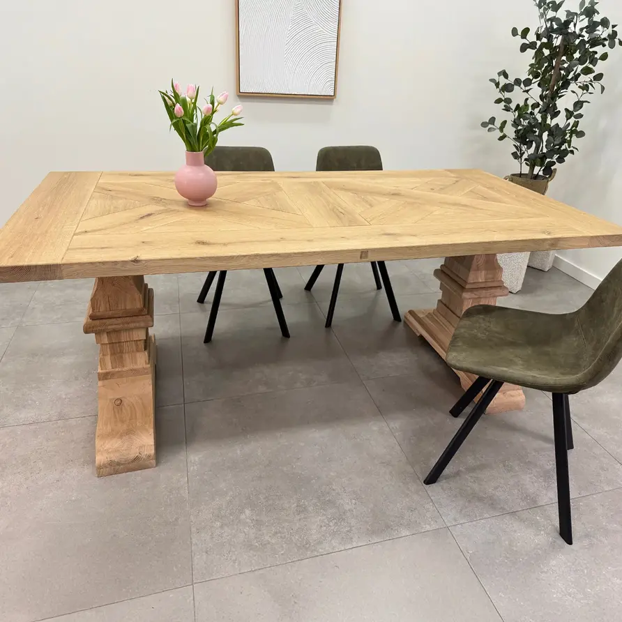 Eiken tafelblad - 4,5 cm dik (massief) - met dubbel kruis patroon & dwarse lamel op de kopse kanten - rustiek eikenhout (B/C) - XL-lamel (circa 20 cm) - geborsteld + V-groeven - ambachtelijk verlijmde tafel - kunstmatig gedroogd (KD) 8-12%. Dit mooie eiken tafelblad van 45 mm dik wordt ambachtelijk gemaakt en is verkrijgbaar in diverse vaste maten. In het tafelblad is een dubbel kruis patroon aangebracht & aan beide "kopse kanten" is het tafelblad voorzien van een "dwarse lamel", perfect voor een traditioneel landelijke look. Het rustieke eikenhout heeft een B-kwaliteit zichtzijde met (mogelijk wat grovere) noesten en scheuren. Dit zorgt voor een levendig en natuurlijk uiterlijk. Ook bent u bij dit eiken tafelblad verzekerd van brede lamellen, voor een (extra!) mooie eiken tafel met een luxe accent.
