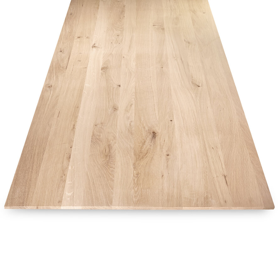 Rustiek eiken (B/C) staat bekend om zijn sfeervolle en warme uitstraling. Het eikenhout is kunstmatig gedroogd (kd) en heeft een vochtpercentage van 8-12%, ideaal voor binnengebruik. Het eiken tafelblad wordt opgebouwd uit doorgaande lamellen in de lengterichting, met een breedte van 6-18 cm, een mooie (brede) lamel. Standaard wordt het eiken tafelblad onbehandeld, fijn geschuurd (finish) & met scherpe randen geleverd. Als u kiest voor een behandeling, worden de randen automatisch afgerond. Daarnaast bieden wij diverse extra opties om uw tafelblad volledig naar wens af te werken.