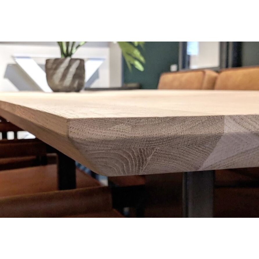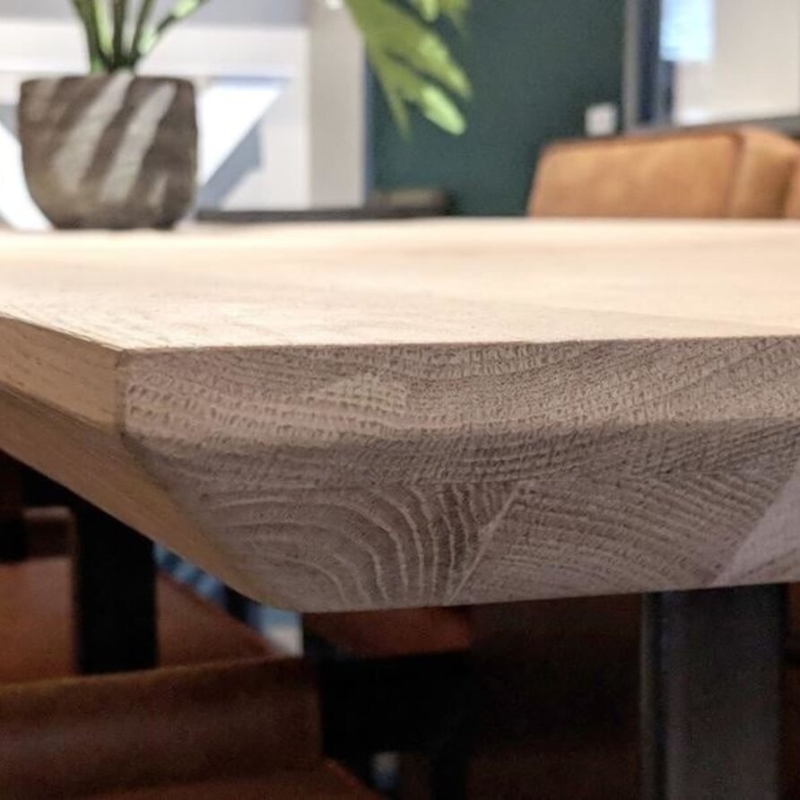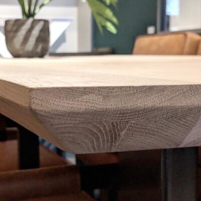 Een eiken tafelblad met verjongde rand - van sfeervol rustiek eikenhout en 4,5 cm dik, 2-laags rondom opgedikt - in verschillende (vaste) afmetingen. Een prachtig verlijmd tafelblad met een modern accent, naar wens te configureren! Lees meer