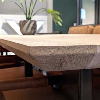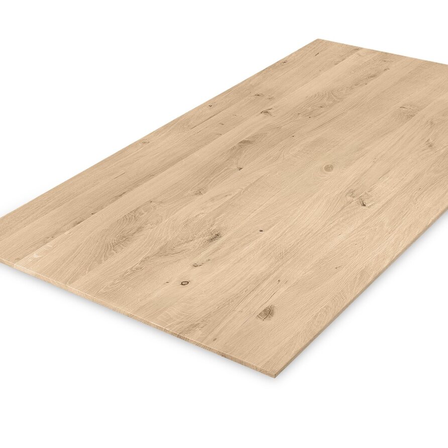 Een eiken tafelblad met verjongde rand - van sfeervol rustiek eikenhout en 4 cm dik - in verschillende (vaste) afmetingen. Een prachtig verlijmd tafelblad (medium lamel) met een modern accent, naar wens te configureren! Lees meer