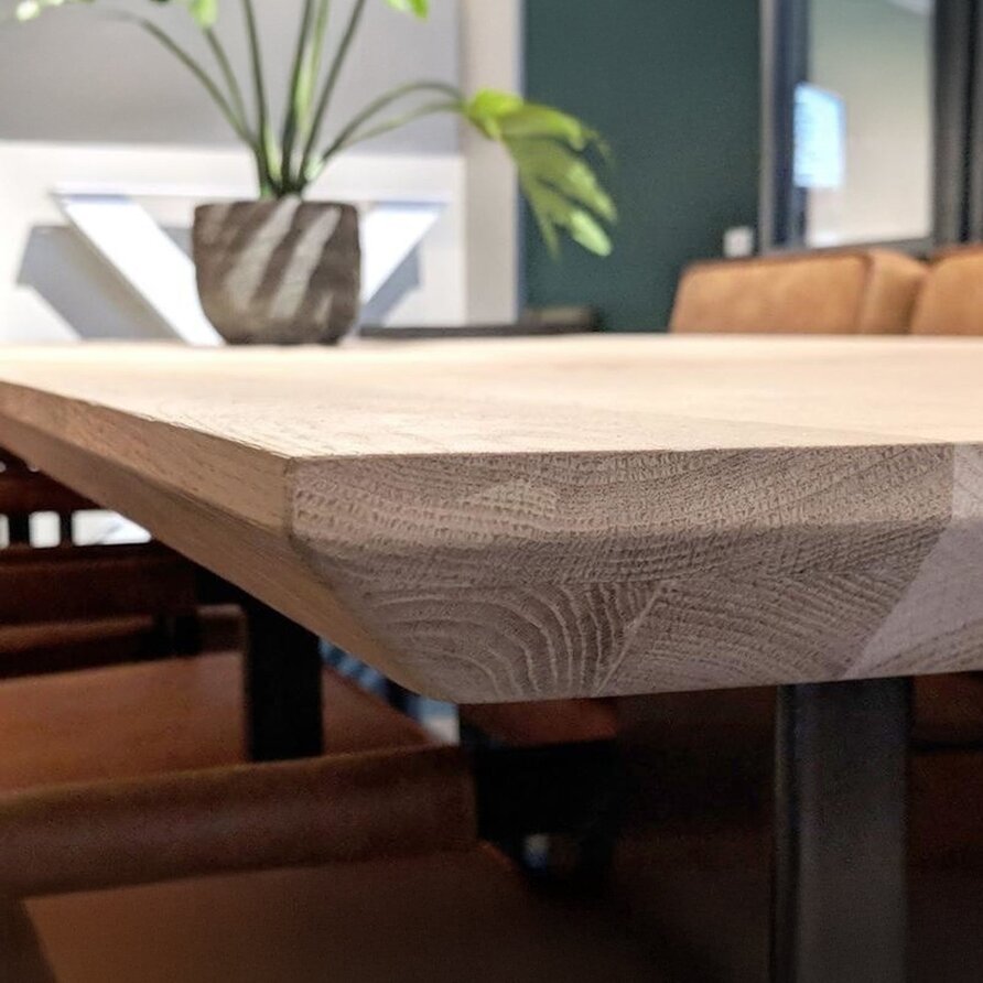 Let op: Het rustiek eiken tafelblad wordt aan de onderzijde standaard voorzien van 2 staalprofielen & (werkings)groeven/sleuven om de kans op werking (vervorming / kromtrekking) te verkleinen, voor een stabiel tafelblad.