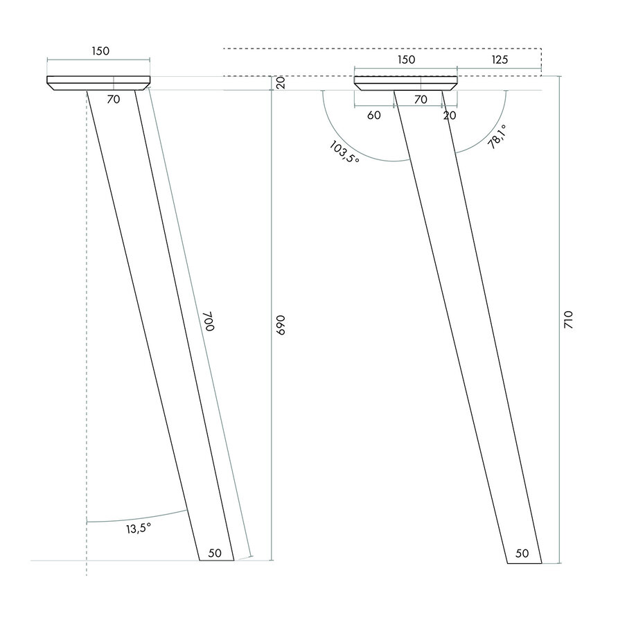 LET OP: Wij adviseren om deze schuine tafelpoten met minimaal 12,5 cm afstand van de rand van het tafelblad "naar binnen toe" te monteren, gemeten vanaf de buitenzijde montageplaat tot aan de buitenzijde van het tafelblad. In dit geval lijnen de tafelpoten aan de onderkant precies uit met het tafelblad. Vaak wordt er - ook vanuit praktisch oogpunt - voor gekozen om de poten nog meer "naar binnen" toe te plaatsen.