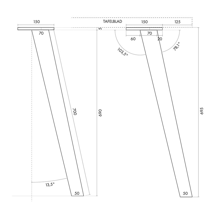 LET OP: Wij adviseren om deze schuine tafelpoten met minimaal 12,5 cm afstand van de rand van het tafelblad "naar binnen toe" te monteren, gemeten vanaf de buitenzijde montageplaat tot aan de buitenzijde van het tafelblad. In dit geval lijnen de tafelpoten aan de onderkant precies uit met het tafelblad. Vaak wordt er - ook vanuit praktisch oogpunt - voor gekozen om de poten nog meer "naar binnen" toe te plaatsen.